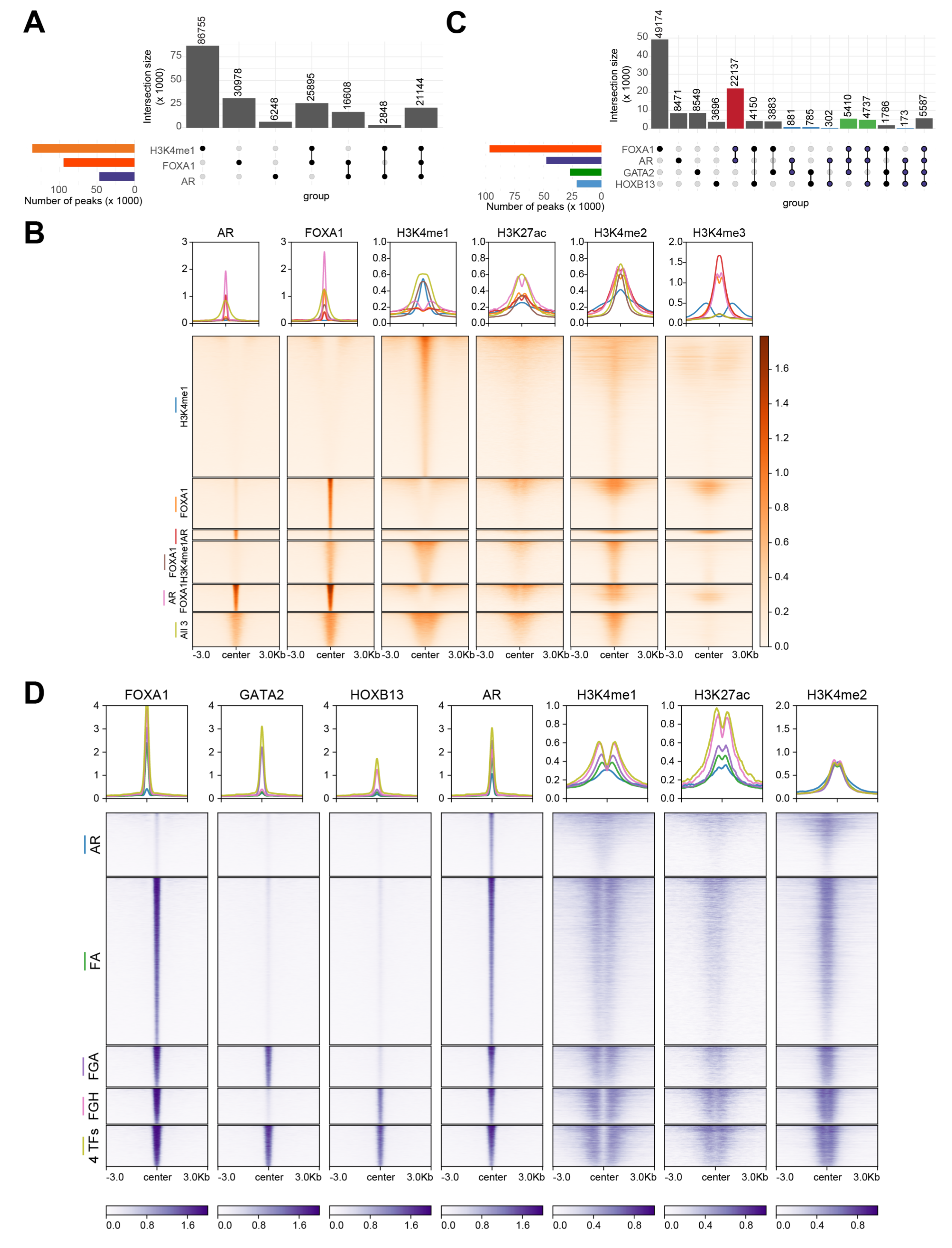 ChIP-seq libraries were mapped to GRCh38 using bowtie2. Bigwig files were created using deeptool’s bamCoverage using Counts Per Million normalization with blacklisted regions removed. Peaks were called using MACS2 using -nomodel –shift 0 –extsize 250 -q 0.01 parameters. Broad peaks were called for H3K4me1. Peak overlapping analysis was performed using Homer’s mergePeaks function. This procedure produced unique and overlapping peak numbers which were provided as the intersection size to ComplexUpset to create the upset plots. Motif analysis was performed using findMotifsGenome from Homer using default parameters. Enrichment of motifs were selected from the % of Target Sequences with Motif from Homer’s known motif enrichment results. Only one motif was picked for each TF: FOXA1(Forkhead)/LNCAP-FOXA1-ChIP-Seq(GSE27824)/Homer, ARE(NR)/LNCAP-AR-ChIP-Seq(GSE27824)/Homer, Gata2(Zf)/K562-GATA2-ChIP-Seq(GSE18829)/Homer, and HOXB13(Homeobox)/ProstateTumor-HOXB13-ChIP-Seq(GSE56288)/Homer.