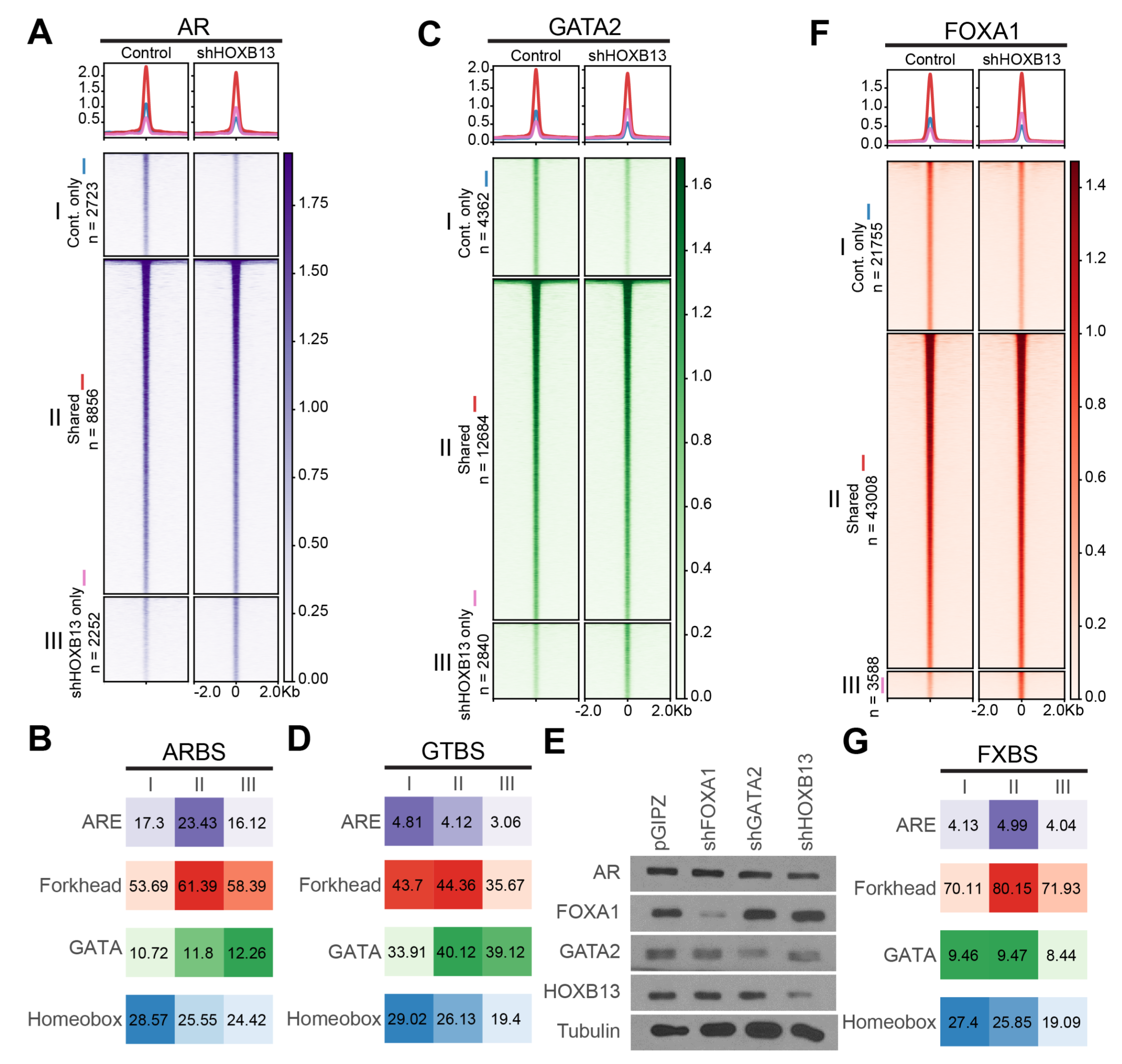 Figure 2 HOXB13 decreases AR and GATA2 protein levels without reprogramming their cistromes. (A, C, F) Heatmaps showing HOXB13 knockdown leads to few reprogrammed AR, GATA2, FOXA1 sites. I: control only, II: shared, III: knockdown only. The color bar on the side indicates the scale of the enrichment intensity. The profile plot on top shows averaged binding intensity across each set of binding sites. (B, D, G) Enrichment of each motif of each TF (B. AR, D. GATA2, G. HOXB13) in each category in the above heatmaps. I: control only, II: shared, III: knockdown only. Numbers indicate % of target sequences with motif found. (E) Western blot of FOXA1, GATA2 and HOXB13 KD efficiency in LNCaP cells.