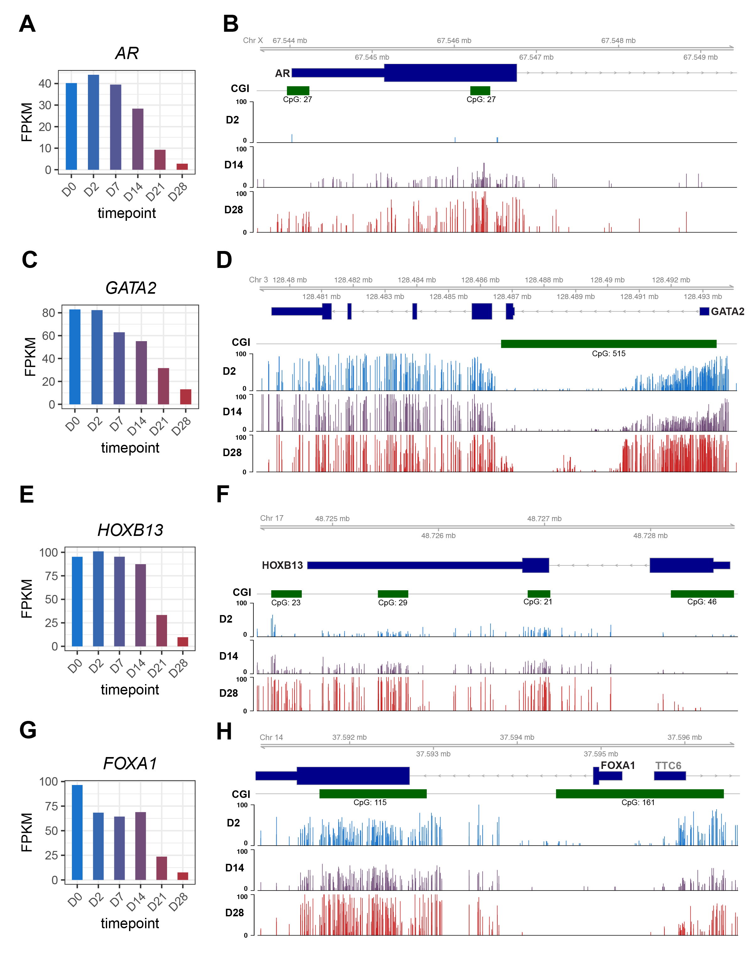 Figure 3 The luminal TFs were reduced during the Neuroendocrine Transformation of PCa by transcriptional or epigenetic repression. (A, C, E, G) Gene expression levels of AR, FOXA1, GATA2, and HOXB13 in time-course RNA-Seq. Genes expression levels are FPKM normalized. (B, D, F, H) Gviz tracks of methylation levels of (B) AR, (D) GATA2, (F) HOXB13 and (H) FOXA1 from time-course RRMS. CpG islands shown in green.