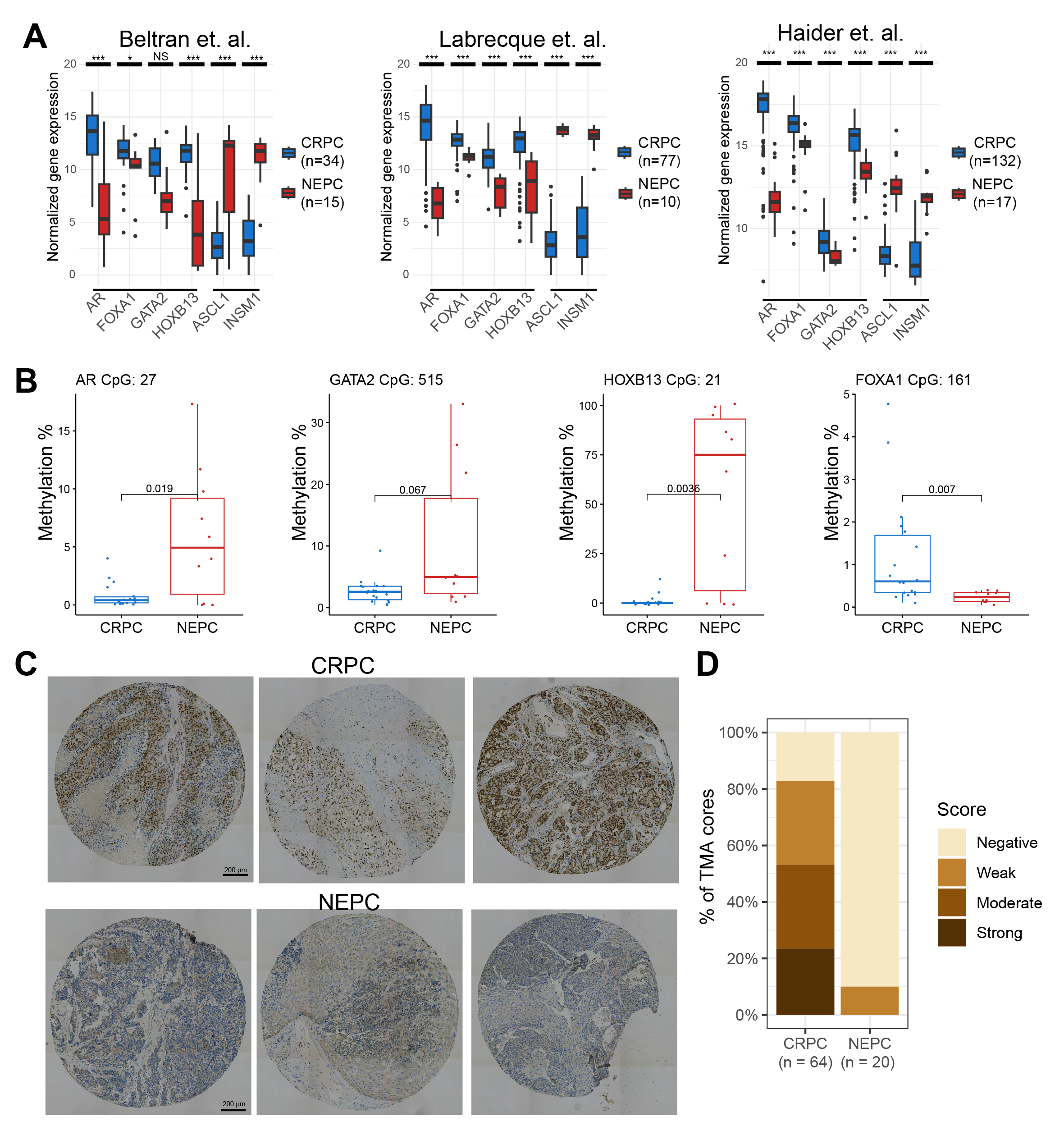 Figure 5 The luminal TFs were reduced in NEPC vs. CRPC tumors. (A) Expression of downregulated TFs (AR, FOXA1, GATA2 and HOXB13) and upregulated TFs (ASCL1 and INSM1) in NEPC vs. CRPC in 3 public datasets. Adjusted p values were obtained from DESeq2 for the Beltran and Labrecque (GSE126078) datasets, and from limma for the Haider (GSE74685) dataset. * p < 0.05, *** p < 0.001, NS non-significant. Log2 normalized values are shown. (B) Boxplots showing DNA methylation percentage of cytosines located in CpG islands near the promoter of each gene. p values were calculated using a t-test. CRPC n = 18, NEPC = 10 patients. (C) Representative IHC images of FOXA1 staining of CRPC and NEPC tissue cores from 3 different patients for each condition. Scale bar: 200μm. (D) Quantification of FOXA1 staining levels in NEPC (n = 20 cores) vs. CRPC (n = 64 cores) TMA sections. Scores are indicated as negative, weak, moderate or strong based on a binned product of the percent of positively stained cells by the staining intensity.