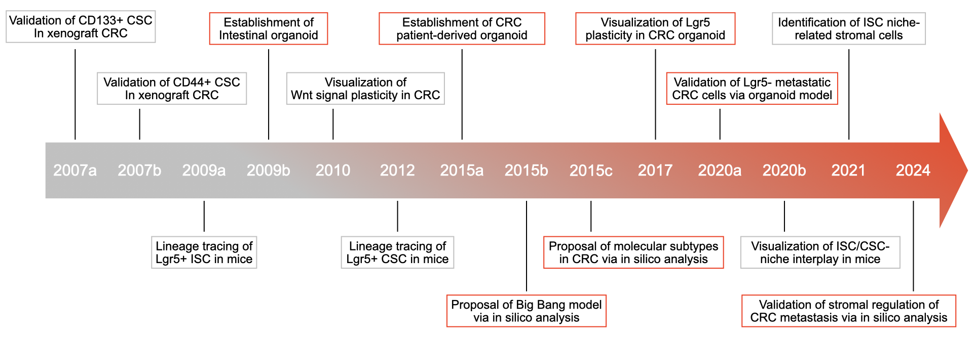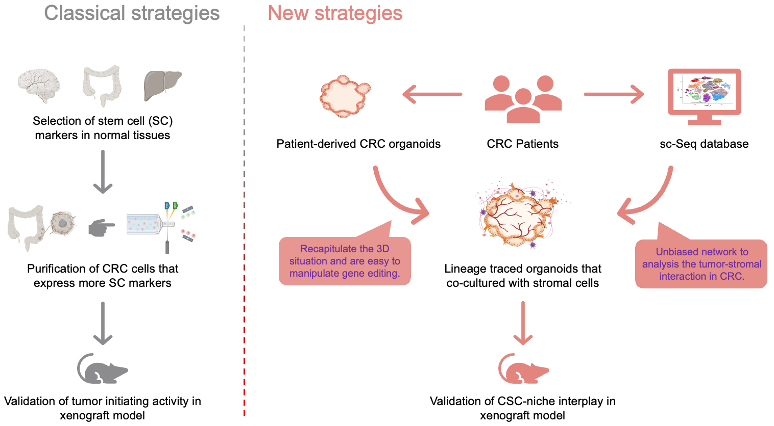 Figure 2 Comparison of classical and new strategies for studying and validating the properties and phenotypic plasticity of CSCs. The development of new technologies, such as single cell sequencing and organoid modeling is expected to advance our knowledge of the role and mechanisms of the influence of CSCs on CRC.