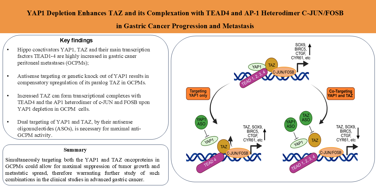 Cite this article: Wu J, Athavale D, Balch C, Zhao J, Zou G, Fan Y, Zhang Y, Zhao J, Ghelfi M, Pompetti A, Calendo G, Scott A, Shao S, Yao X, Pizzi MP, Vellano C, Khazak V, Zhang S, Yap TA, Dhar SS, Sundar R, Spitz F, Grana G, Ajani JA, Song S. YAP1 depletion enhances TAZ and its complexation with TEAD4 and AP-1 heterodimer C-JUN/FOSB in gastric cancer progression and metastasis. Cancer Heterog Plast. 2026;3(1):0003. https://doi.org/10.47248/chp2603010003