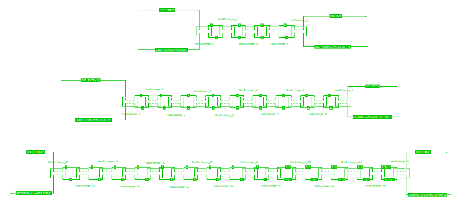 To ensure the accuracy of the calculations of the UA parameter in the power plant’s heat exchangers, detailed sub-models of the geothermal heat exchanger and the water-condenser heat exchanger were utilized, in which the overall heat transfer process in the heat exchangers was divided into various sub-units. At the next step, a sub-unit independency study was performed, considering the heat exchangers consisted of varying numbers of sub-units (1,5,10,15 and 20), in order to effectively capture the influence of the sCO2 thermophysical property variations, mainly of enthalpy and specific heat capacity (Cp), on the calculation of the logarithmic mean temperature difference and thus, to the calculation of the overall UA parameter value in each heat exchanger. These sub-unit models were developed using the COCO simulator, applying four scenarios to both the geothermal water and cooling water condenser heat exchangers, with configurations of 5, 10, 15, and 20 sub-units, as illustrated in Figure 3. Then, the total UA value was calculated as the sum of the UA values of all sub-units of the heat exchangers.