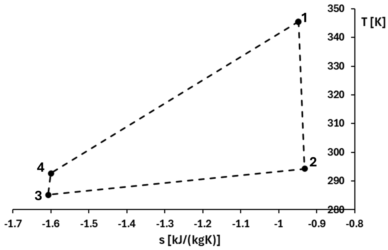 In the next step a thermodynamic analysis of the binary-cycle power plant was conducted taking into account the thermodynamic conditions and components performance characteristics as described in Table 2. The selected operating conditions were determined based on the findings of the work of Karypidis et al. [27]. The main results of the binary cycle power plant are summarized in Table 4. The thermodynamic cycle of the binary plant under investigation is presented in Figure 4.