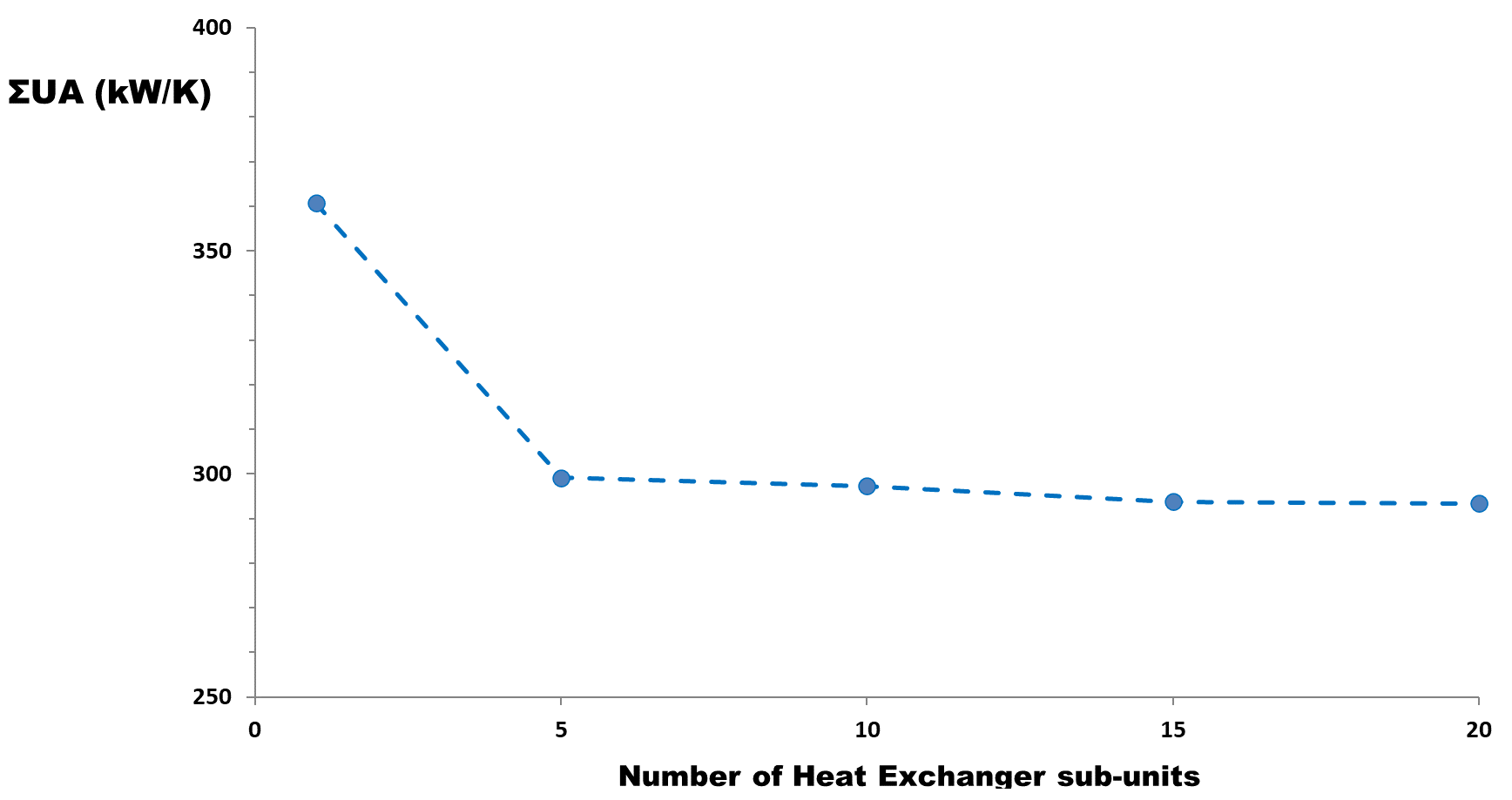 Figure 6. UA vs number of heat exchangers sub-units for condenser heat exchanger (counterflow alignment is assumed).