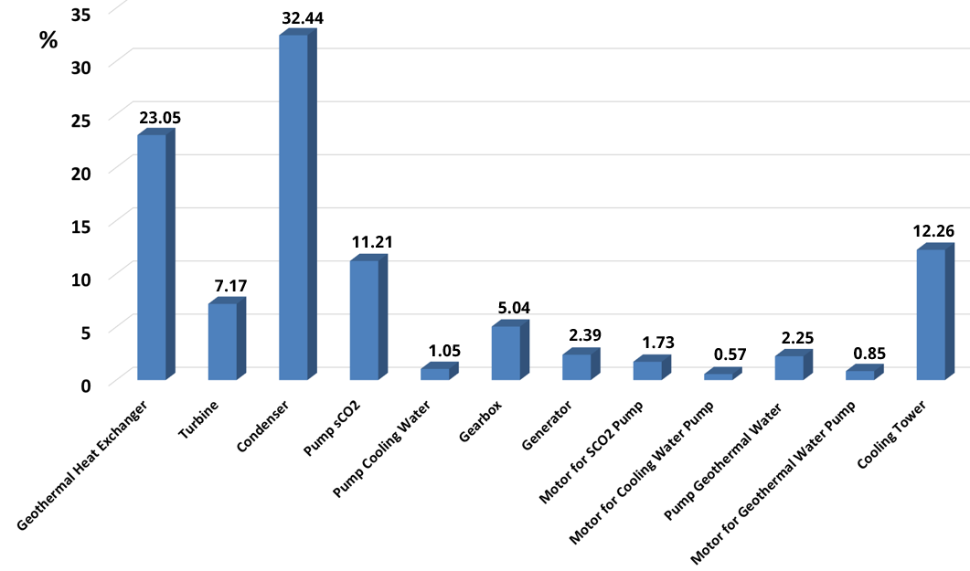 In the subsequent step, based on the thermodynamic cycle results and the estimated UA values of the heat exchangers, the purchase costs of the main components of the geothermal power plant were evaluated using the dedicated correlations from the international literature, as presented in Table 3. The results are illustrated in Figure 7, which presents the percentage distribution of the cost-components.