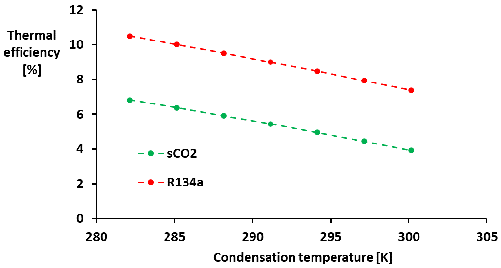 As can be seen also in Figure 8, in all cases the use of R134a results in improved thermodynamic cycle performance in relation to sCO2. However, taking into consideration the planned hydrofluorocarbon (HFC) phase-down in Europe for 2030 the use of carbon dioxide as working fluid becomes more interesting. Thus, further efforts are required to enhance the performance of sCO2-based thermodynamic cycles, given the significant environmental advantages associated with replacing HFCs with carbon dioxide.