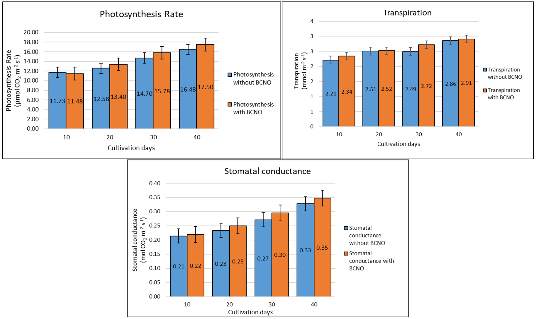 Furthermore, the total chlorophyll concentration increased with the application of BCNO in the covering material (Figure 6). Specifically, chlorophyll levels rose by 8.12% and 8% at days 10 and 20, respectively, followed by smaller increases of 1.9% at day 30 and 5.37% at day 40. This enhanced total chlorophyll concentration likely contributed to improved gas exchange rates and stimulated physiological parameters in the leaves. Also, additional measurements of physiological leaf parameters carried out with the Portable Photosynthesis System, indicated increased photosynthesis rates, transpiration rates and stomatal conductance of plants grown hydroponically into the greenhouse with BCNO covered material, compared to hydroponically cultivated plants into the control greenhouse respectively (Figure 7). Specifically, photosynthetic rates showed a slight initial decrease at day 10 (-2.13%) but consistently increased thereafter by 6.51%, 7.34%, and 6.19% at days 20, 30, and 40, respectively. Transpiration rates were also generally higher, peaking at day 30 (+9.23%), while stomatal conductance showed a steady improvement throughout the period, with the most notable increases observed at day 20 (+8.69%) and day 30 (+11.11%). These physiological gains reflect the previously noted increases in biomass and chlorophyll levels. All measurements were performed on leaves of a similar age, fully developed, on different days but at the same time of day and with similar weather conditions (full sunlight). All values are summarized in Table 1; positive values indicate an increase, while negative values indicate a decrease relative to the control group. The increased PAR in the presence of BCNO covered material, increased biomass content, total chlorophylls content, photosynthetic CO2 assimilation rate, respiration rates and stomata conductance achieved healthy growth and higher yields, in accordance with earlier findings [28,29].
