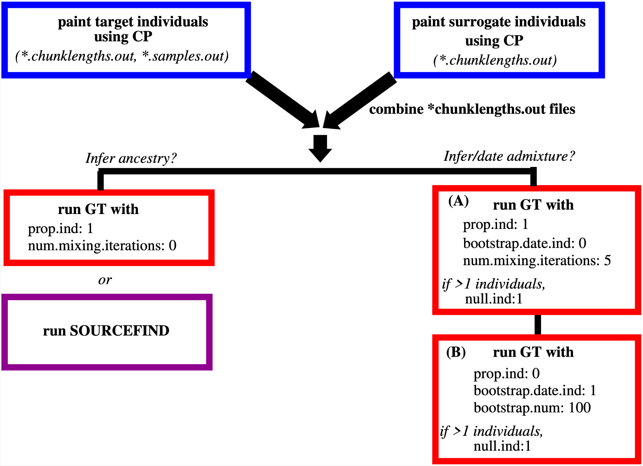 We will also describe how to use the program ChromoPainter [14], which infers the amount of recent ancestor sharing among individuals, to generate the necessary input data for fastGLOBETROTTER. Some of this ChromoPainter output is also used as input for the ancestry inference software SOURCEFIND [15], described briefly below. We note that output from ChromoPainter can also be used to cluster individuals into genetically homogeneous groups using the program fineSTRUCTURE [14]. However, for simplicity here we will focus only on using ChromoPainter to detect and date admixture using fastGLOBETROTTER. For a tutorial on how to use ChromoPainter for clustering, see https://people.maths.bris.ac.uk/~madjl/finestructure-old/chromopainter_info.html.