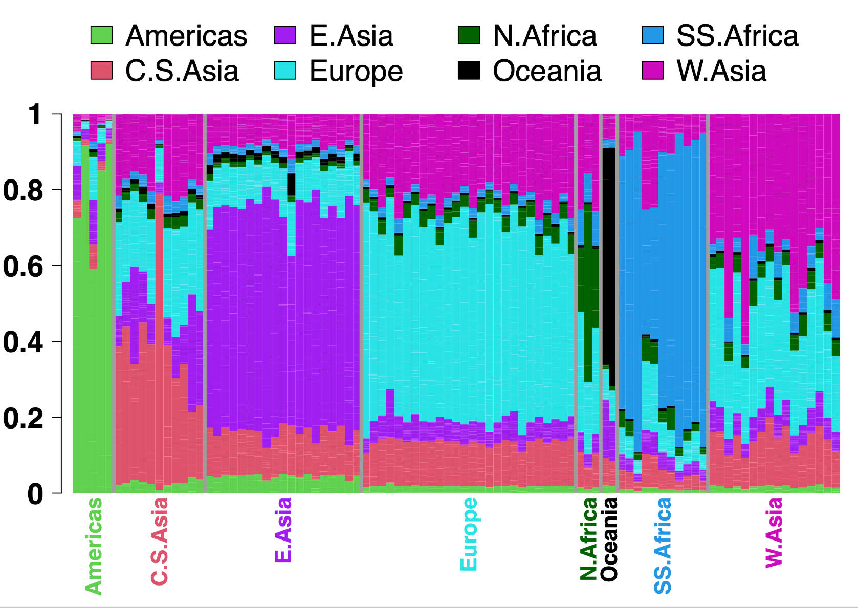 Figure 3. ChromoPainter inferred painting for the 93 surrogate populations. Each bar depicts the proportion of genome-wide DNA for which individuals from the given population are, on average, painted by donors from each of eight worldwide geographic areas (colors). Labels between grey vertical lines give the geographic area each surrogate population is sampled from, with colors corresponding to the legend at top. Note that while the 93 surrogate populations are largely painted by donors from the same geographic area, some parts of their genomes are painted by donors from other areas, analogous to the “noisy” painting seen in Figure 2.