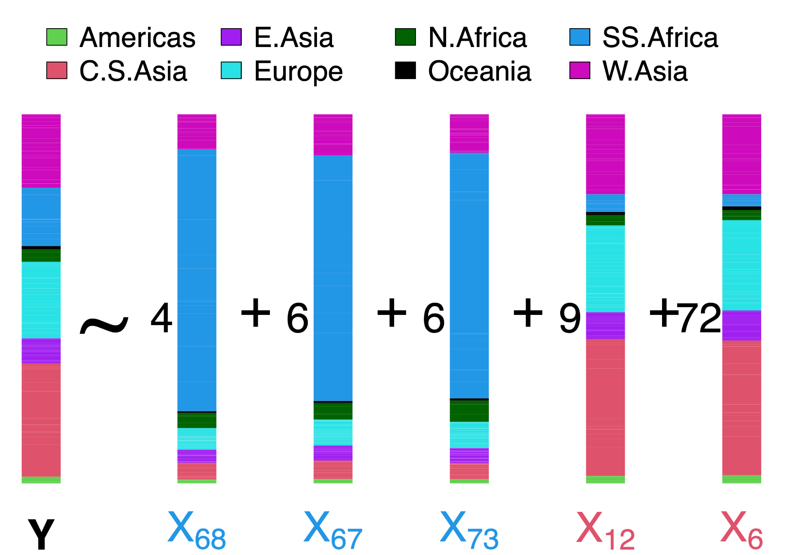 Specifically, let Yd be the total proportion of genome-wide DNA in a target individual that is painted by some donor d. Analogously, let (X1d,…,XSd ) be the total proportion of genome-wide DNA painted by donor d in surrogate populations 1,…,S, respectively. For example, if d = “Sub-Saharan African” donors, the dark blue proportions in Figure 3 depict (X1d,…,XSd ) for the S=93 surrogate populations. fastGLOBETROTTER assumes that the expected value of Yd, i.e., E[Yd], follows: