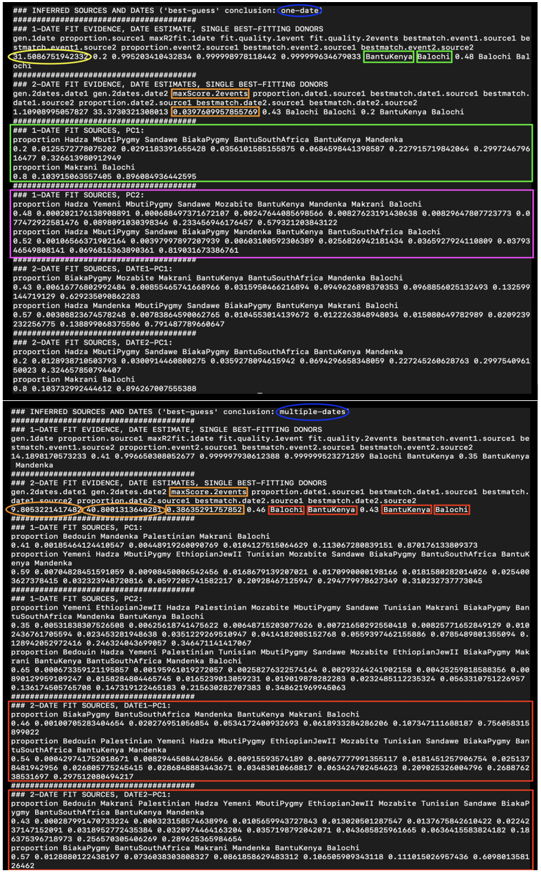 Figure 5. Examples of *.main.txt output files from fastGLOBETROTTER, for the simulations with one pulse (top) and two pulses (bottom) of admixture. FastGLOBETROTTER’s best-guess conclusion for the type of admixture in each case is given at top (blue circles), with inferred dates when assuming either one date (yellow circle) or two dates of admixture (orange circle) given underneath this. Concluding “multiple-dates” is based on “maxScore.2events” (orange box) being >=0.35, a threshold chosen based on simulated results [7]. As “one-date” is inferred in the top case, we use the yellow circle, and we use the inference in the green boxes to describe (top green box) the surrogate population that is inferred to be most genetically similar to each admixing source and (bottom green box) the proportions contributed by each of the two admixing sources and each source’s inferred genetic make-up. This genetic make-up is described as a mixture of the surrogates by using the model illustrated in Figure 4. (If “one-date-multiway” is inferred, indicating >2 sources intermixing around the same time, we also use the inference in the purple box, but that is not the case here.) As “multiple-dates” is inferred in the bottom case, we instead use the orange circle, and we use the inference in the red boxes to describe the inferred sources and proportions, separately for the first inferred admixture date (underneath “2-DATE FIT SOURCES, DATE1-PC1”, representing the inferred date “gen.2dates.date1” at top) and for the second inferred admixture date (underneath “2-DATE FIT SOURCES, DATE2-PC1”, representing the inferred date “gen.2dates.date2” at top).