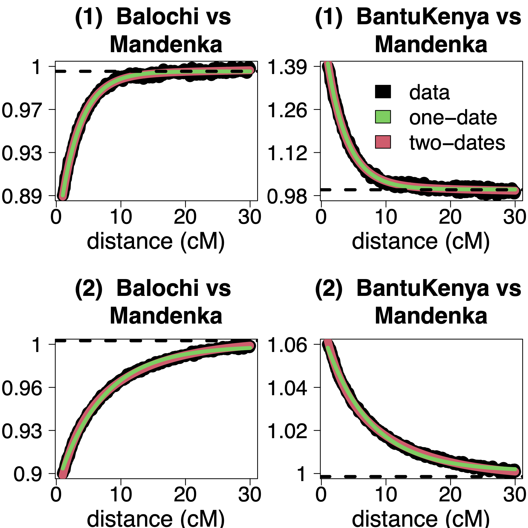 Finally, the user should check whether the model assuming two dates of admixture fits the curves substantially better than the model assuming only one date; if not, the one date fit is a more parsimonious solution.