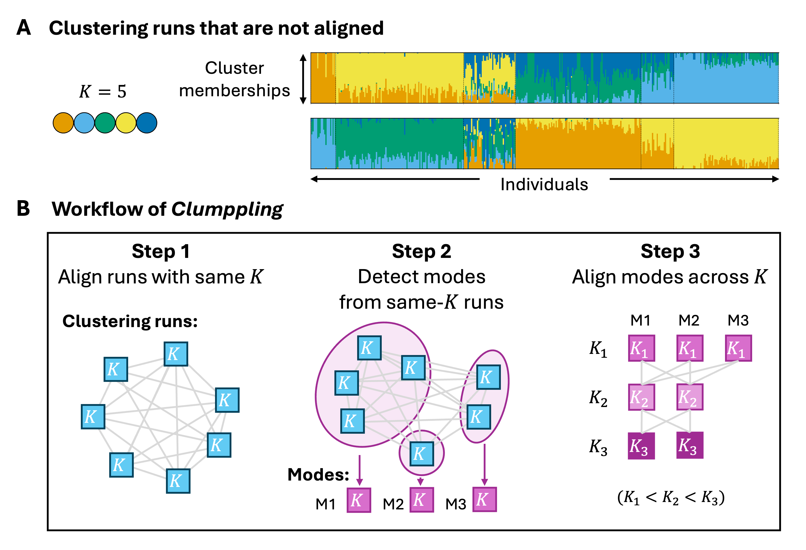 Figure 1. Unaligned clustering results and the workflow of Clumppling. (A) Bar plots from two example runs with K = 5 clusters, illustrating substantially different results. Unaligned plots are difficult to compare. (B) The workflow of