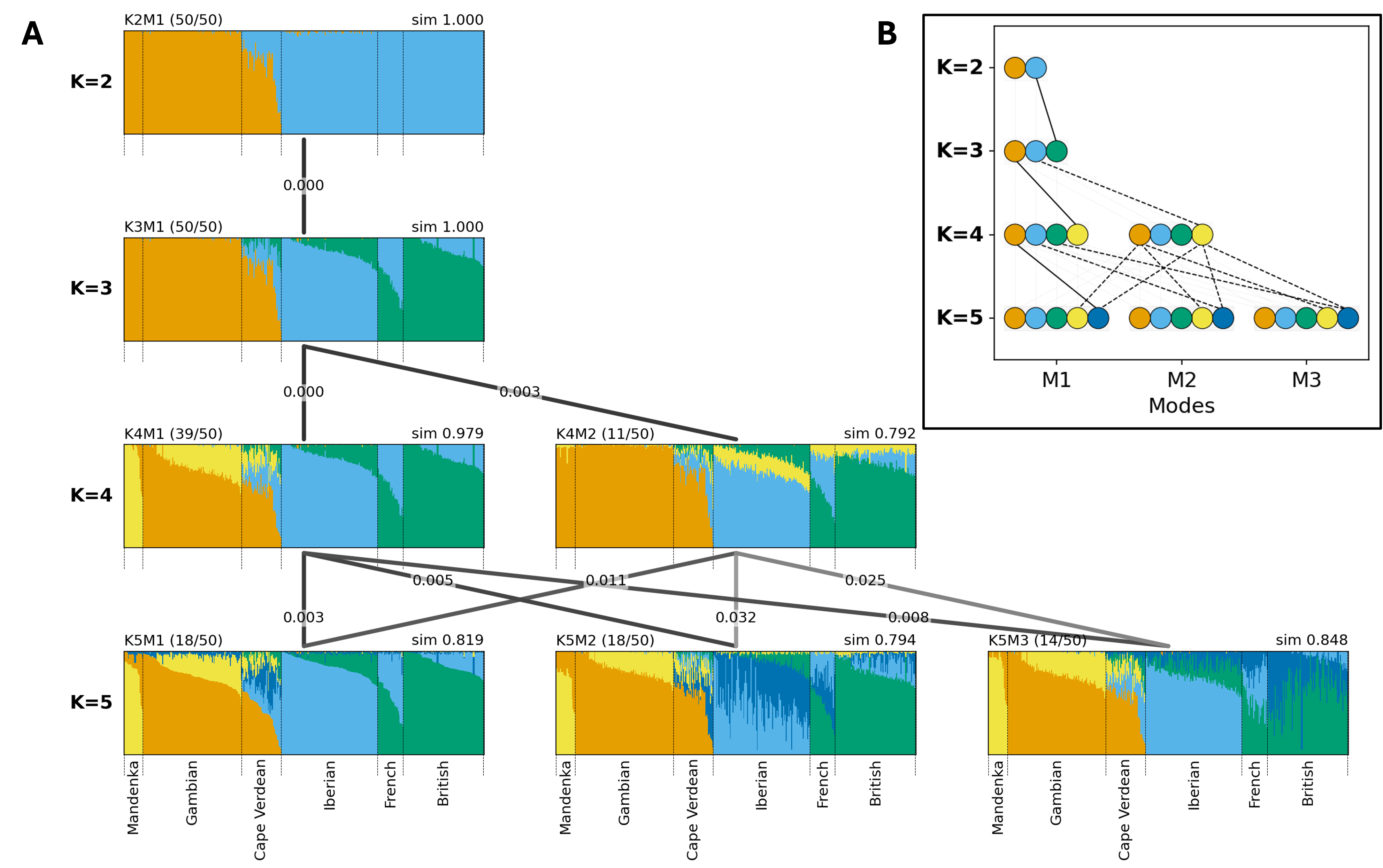 Figure 2. Clustering results from Cape Verde data aligned by Clumppling. There are 50 clustering runs for each K from 2 to 5. Detected modes are labeled, for example, “K2M1” (mode 1 of K = 2). (A) Clumppling’s multipartite graph of bar plots, showing the aligned memberships in each mode. For each bar plot, the mode size (i.e., the number of clustering runs contained in that mode) of all runs with the given K is shown in parentheses at the upper left, and the within-mode alignment similarity is shown at the upper right (e.g., sim=0.979). Modes with numbers of clusters K and K + 1 are connected by lines, where edge labels indicate alignment cost and edge color reflects alignment similarity. Darker edges indicate mode pairs with higher similarity, whereas lighter edges indicate poorer alignment. Individuals are grouped and labeled according to their population (provided as auxiliary labels by the user). Within each label group, individuals are displayed in decreasing order (left to right) by their membership in the cluster with the largest total membership in one specific plot (here K5M1); individuals are placed in this same order for all modes and all K. (B) The alignment pattern graph in