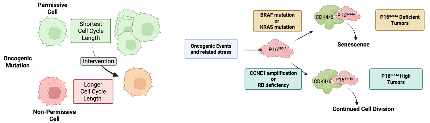 Outside of direct permutations to the cell cycle machinery, veritably all cancers are characterized by classic cancer hallmarks such as mitogen-independent growth and escape from proliferative limitations, among others [73]. In the context of many oncogenic drivers, there are specific mechanisms through which they promote deregulation of cell cycle (e.g., upregulation of Cyclin D1 and depletion of p27Kip1) [74, 75]. Oncogenes in the RAS-BRAF-MAPK pathway can potently drive proliferation but also have the capacity to drive oncogene-induced senescence [76,77] (Figure 4B). This particular response to oncogenic signaling is caused at least in part by the upregulation of p16INK4A, which inhibits CDK4/6 to limit cell cycle progression [77,78]. This phenomenon is likely very effective in limiting tumor development, as benign nevi that are driven by mutant BRAF are arrested in G1 by p16INK4A and can remain in that non-malignant state [79]. Presumably, this is a relatively general mechanism to suppress oncogenesis and likely explains why genetic or epigenetic loss of the CDKN2A locus is a particularly common event in tumors driven through this KRAS-BRAF-MAPK axis (Figure 4B). Interestingly, this induction of CDKN2A also occurs with oncogenes that intrinsically bypass the requirement for CDK4/6 [80,81]. For example, tumors driven by RB loss or CCNE1 amplification almost invariably overexpress p16INK4A [56,82,83]. This is likely an epigenetic vestige of the oncogenic stress mediated by loss of RB or Cyclin E gain; however, in this context, cell division can continue with high p16INK4A (Figure 4B).