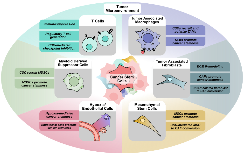 Within the context of the TME, CSCs and stemness appear to be highly dynamic. While CSCs may possess intrinsically higher activity in pathways that promote self-renewal and stemness, a multitude of signals from the TME also plays a significant role in maintaining stemness. Cytokines, growth factors, and other exosome-derived molecules such as miRNAs secreted by CAFs; MSCs; immune cells such as MDSCs, TAMs, and T cells; and other non-CSCs and CSCs contribute to the activation of numerous stemness-promoting pathways in CSCs. In turn, CSCs themselves contribute to the TME signaling landscape to recruit and polarize TAMs, convert normal fibroblasts to CAFs, promote angiogenesis, and suppress immune activity. Clearly, regulation of CSCs and stemness is a complex and reciprocal process.