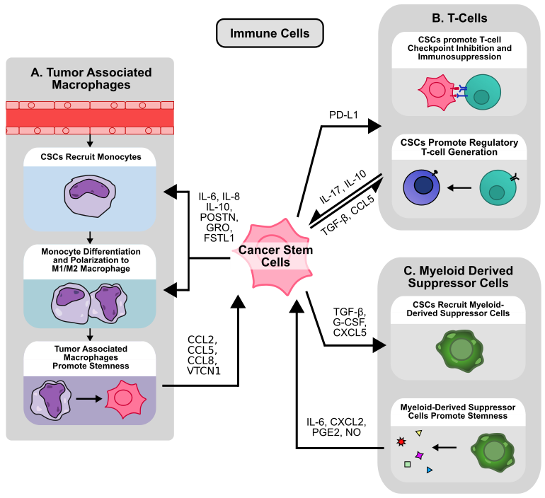 Tumor associated macrophages (TAMs) are macrophages found within the TME, and originate either from tissue resident macrophages or circulating monocytes, the latter of which is the main source of TAM replenishment [76]. Monocyte-to-macrophage differentiation is driven by complex environmental cues and immune/cancer cell secreted cytokines such as colony stimulating factor (CSF) 1, CSF-2, and IL-34 [77]. Once differentiated, these monocytes can be further polarized by signals within the TME into two general categories, M1-polarized and M2-polarized macrophages. M1-polarized macrophages are recognized as tumor-suppressive, while M2-polarized macrophages are known for their tumor-promoting abilities [78]. However, these categories are likely an oversimplification, and macrophages in vivo exist on a spectrum of activation states influenced by a complex network of immune signals [79], of which CSCs play a critical role (Figure 3A). For example, in GBM, CSCs preferentially express periostin (POSTN) to recruit monocytes to the tumor site and promote polarization to an M2, tumor-promoting state via integrin αvβ3 signaling, a finding recapitulated in ICC [80,81]. Similarly, glioma stem cells (GSCs) induced STAT3 phosphorylation and STAT1 dephosphorylation in macrophages to promote M2-polarization and secretion of immunosuppressive IL-10 [82]. Inflammatory breast CSC-like cells also recruit monocytes and promote M2-polarization via IL-8 and GRO-mediated STAT3 phosphorylation in monocytes [83]. Additionally, numerous other studies have demonstrated the ability for CSCs to polarize monocytes to M2-like macrophages [84,85]. CD133+ GSC-derived IL-6 and IL-10 activate STAT3 signaling within macrophages to activate downstream expression of VTCN1. VTCN1 inhibits macrophage phagocytosis, T cell IL-2/IFN-γ production, and promotes T cell apoptosis, and silencing of VTCN1 in macrophages reduces tumor growth in vivo [86]. GSCs also preferentially express WISP1, which promotes stemness in an autocrine manner while promoting M2 TAM survival via integrin α6β1/Akt signaling [87]. Likewise, GSC-derived FSTL1 promotes stemness by activating PI3K-Akt signaling in an autocrine manner, while also promoting macrophage recruitment and M2 polarization in vivo [88].