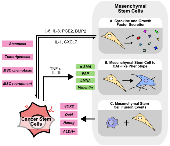 Apart from directly mediating cancer stemness, MSCs have also been suggested to convert to a CAF-like phenotype (Figure 4B). Long-term stimulation with TNF-α and IL-1b imparts MSCs with CAF-like morphology, increased vimentin and FAP expression, and an increased ability to contract collagen gels [158]. MSCs cultured in stiff, ECM-mimicking conditions acquire a CAF-like phenotype upon treatment with breast cancer cell-derived conditioned media. These CAF-like cells downregulate the MSC marker Stro-1 while upregulating CAF markers α-SMA and LMNA [159]. Similarly, transcriptomic analysis of MSCs treated with exosomes derived from colorectal cancer cells reveals an increase in CAF-related genes such as α-SMA and FAP [160]. Considering the substantial evidence supporting the role of CAFs in promoting stemness, context-dependent transformation of MSCs to CAFs may represent an additional mechanism of MSC-mediated enhancement of cancer stemness. Additionally, MSCs may also fuse with non-CSCs to generate CSC-like cells (Figure 4C). Dornin et al. provide evidence to suggest that breast cancer cells fused with MSCs contain a higher proportion of ALDH+ CSCs and also express higher EMT markers [161]. Similarly, lung cancer-MSC and normal epithelial cell GES1-MSC fusion hybrids express higher levels of EMT markers and possess increased tumorigenicity in vivo [162,163]. Fusion hybrids of GBM cells and MSCs demonstrate higher stemness markers SOX2, Oct4, and Nanog in vitro, while displaying increased tumorigenicity in vivo [164].
