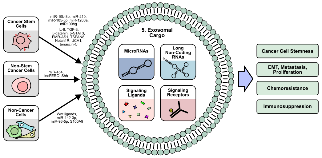 Recipients of CSC and non-CSC-derived exosomes are not only limited to cancer cells. CSC-derived exosomes have been demonstrated to mediate immune cell activity and promote immunosuppressive TME. While Wang et al. demonstrate that exosomal miR-210-3p can inhibit FGFRL1 in cancer cells [178], CSC-derived exosomes containing miR-210 also target macrophages in prostate cancer. Inhibition of FGFRL1 in macrophages promotes M2 polarization, while co-injection of these M2-polarized macrophages with prostate cancer cells promotes tumor growth and gemcitabine resistance in vivo [182]. In oral squamous cell carcinoma, CSCs produce exosomes containing the lncRNA UCA1, which inhibits miRNA-134-mediated silencing of laminin γ2 (LAMC2) in macrophages. The resulting upregulation of LAMC2 in macrophages and CD4+ T cells upon exosomal delivery of UCA1 promotes M2-polarization and reduces the proportion of activated IFNγ+/CD4+ T cells [183]. Similarly, tenascin-C, an ECM glycoprotein, is packaged into exosomes by glioblastoma stem cell-like cells to reduce T cell proliferation and activation via tenascin-C/α5β1 and αvβ6-mediated signaling [184].