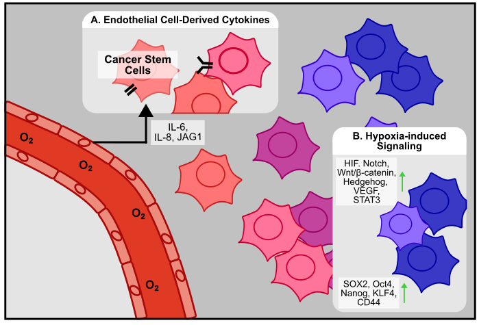 Emerging evidence indicates that endothelial cells, beyond forming new vasculature, also actively contribute to CSC maintenance through direct and paracrine interactions (Figure 6A). In brain tumors, Nestin+/CD34- CSCs are associated with endothelial cells in vivo, and also physically interact in vitro. Co-culture experiments demonstrated that endothelial cells enhance CSC self-renewal, while co-injection of CSCs and endothelial cells in vivo promotes tumor proliferation [203]. A similar phenomenon has been demonstrated in CRC, where endothelial cells are associated with CD133+ CSCs in vivo, enrich the proportion of ALDH1+ and CD133+ CSCs, and dedifferentiate cancer cells to CSCs via secretion of Notch ligand Jagged1 in vitro [204]. In GBM, endothelial cell-derived IL-8 is responsible for promoting stemness and tumor growth in vivo [205]. Similarly, in HNSCC, endothelial cells enhance cancer cell stemness via secretion of IL-6, and co-injection of endothelial cells with ALDH+/CD44+ CSCs increases tumorigenesis in vivo [206]. While ample evidence demonstrates the close association and interaction between endothelial cells and CSCs, Conigliaro et al. show that in HCC, CSC-derived exosomes containing the long noncoding RNA lncRNA H19 are responsible for promoting the attachment of CSCs to endothelial cells [207].