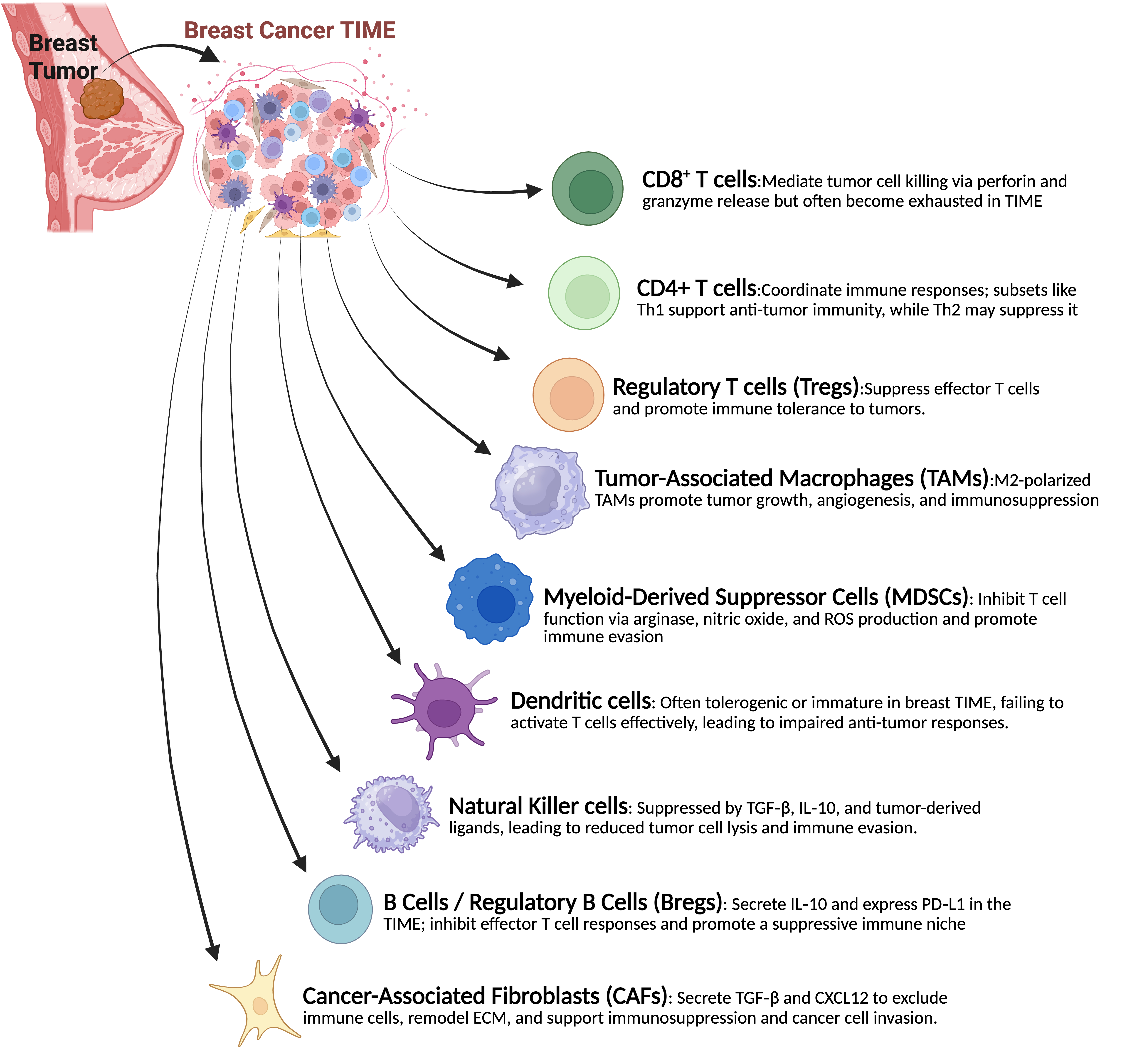 In BC, the TIME plays a crucial role in determining the disease's progression, immunological surveillance, and response to treatment. Cancer cells interact with it in intricate and dynamic ways through a variety of immune cell types. To improve successful immunotherapy methods, a thorough understanding of the makeup and functional roles of these immune components is essential. A brief explanation of their function is discussed in Figure 1.