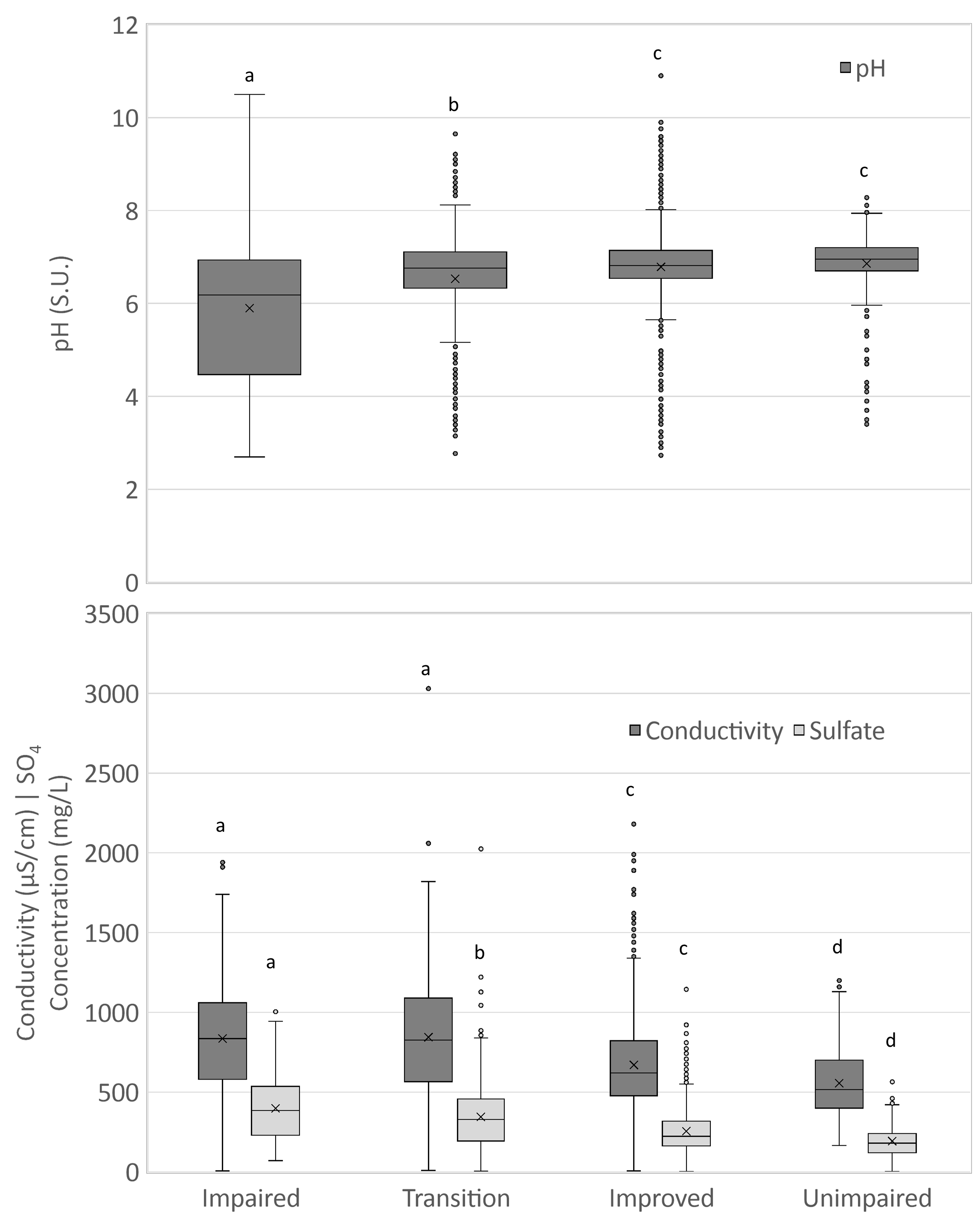 pH was significantly lower in the Impaired zone than the Transition zone where it was significantly lower than the pH in the Improved and Unimpaired zones. The pH was not significantly different between the Improved and Unimpaired zones. Conductivity was similar in the Impaired and Transition zones, while conductivity was significantly lower in the Improved zone and lower still in the Unimpaired zone. Sulfate results were akin to conductivity results, however, all four zones were significantly different than each other, with lower sulfate concentrations as the zones moved towards improvement (Figure 2).