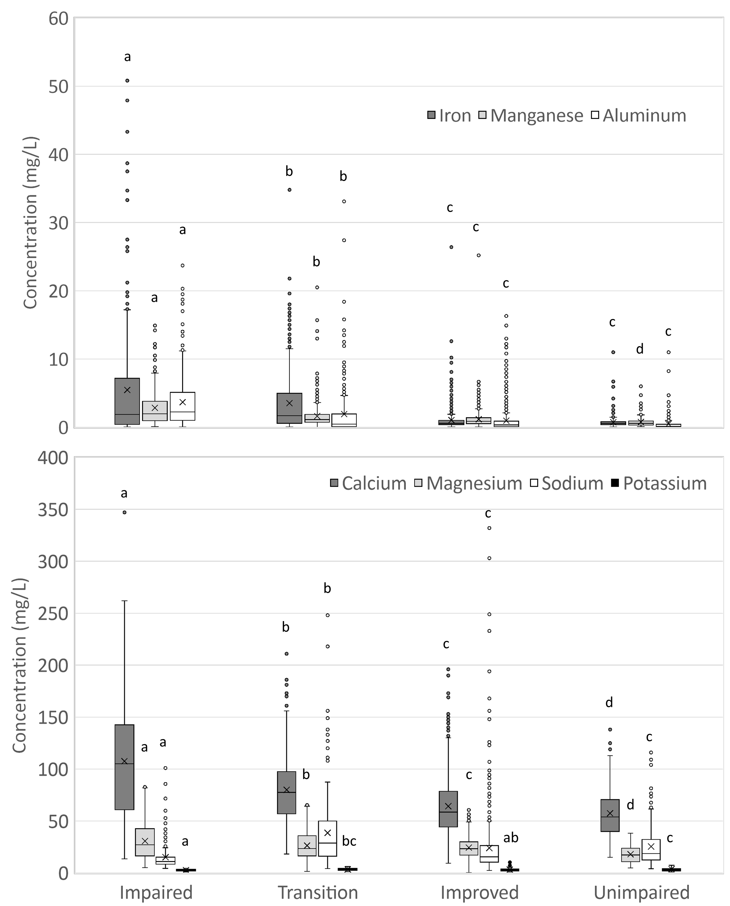 Likewise, metals that are often considered key indicators of AMD impairment were also significantly different across zones (Figure 3). Iron, aluminum, and manganese were each significantly different between the Impaired, Transition, and Improved zones, while manganese was additionally significantly different in the Unimpaired zone. Mean values for iron, aluminum, and manganese decreased with improvement. While not generally considered indicators of AMD impairment, calcium and manganese were also significantly different between all four zones with lower concentrations moving towards improvement. Sodium was significantly different between the Impaired, Transition, and Improved zones, but were similar between the Improved and Unimpaired zones. Potassium held a less-obvious relationship to zones of improvement, while there were statistically significant differences between zones.