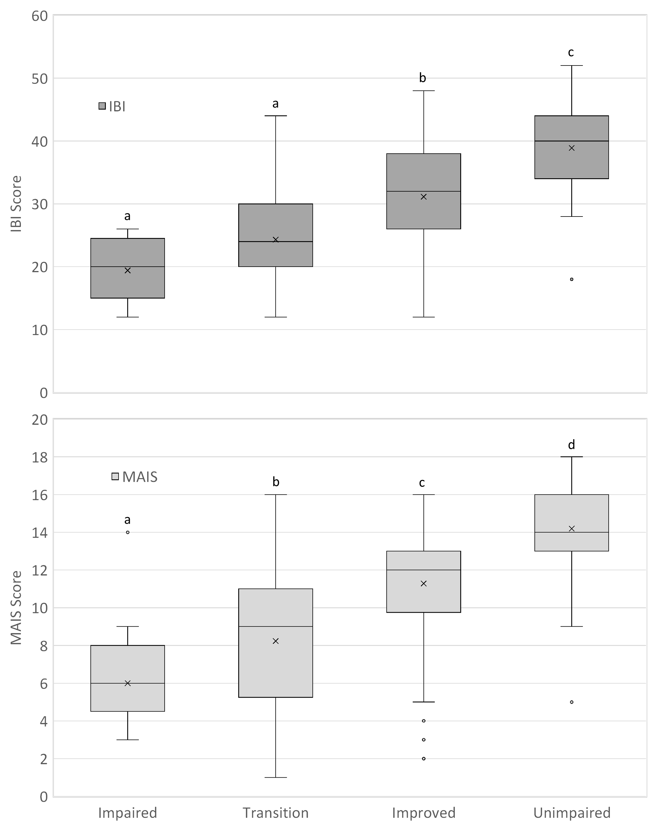 Figure 4 IBI (fish) and MAIS (aquatic macroinvertebrate) metrics by recovery zone. IBI scores were significantly different between recovery zones, except for between the Impaired and Transition zones. MAIS was significantly different between each recovery zone.