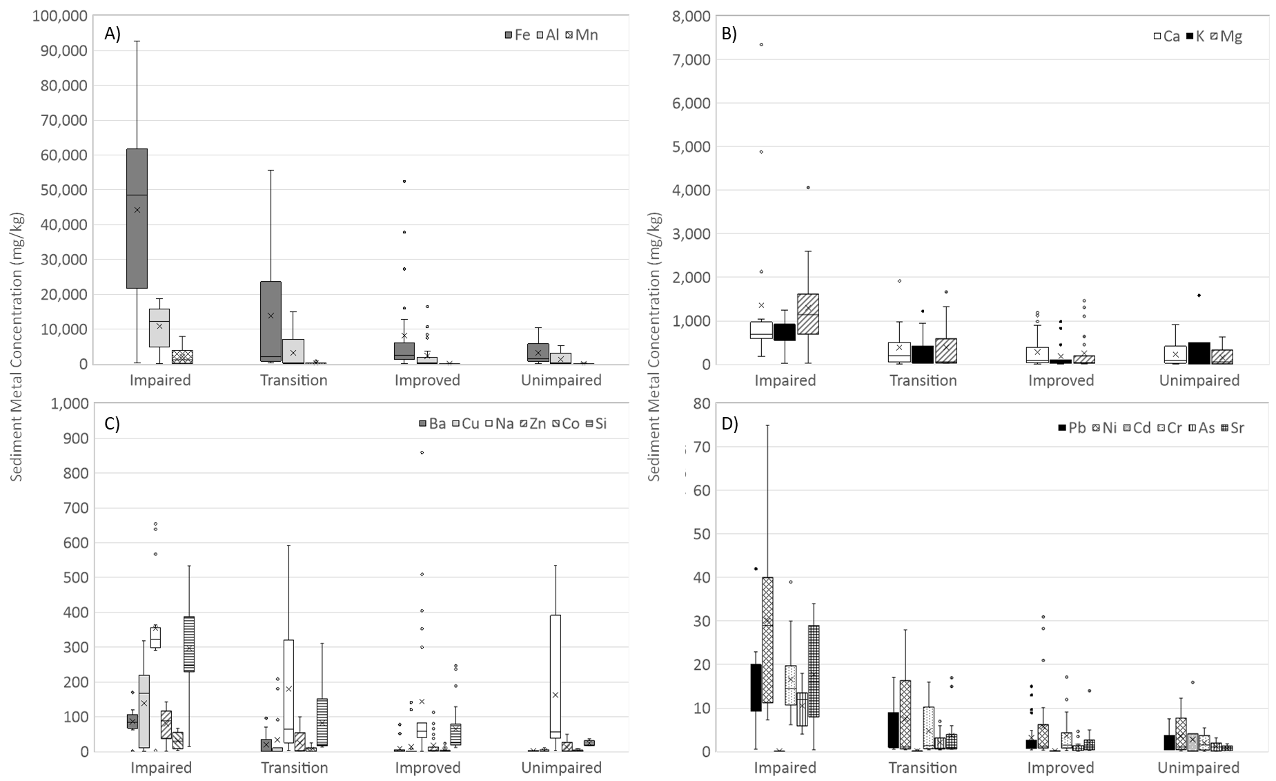 The sediment metal concentrations for these major metals (Fe, Al, Mn, Ca, Mg, Na) alongside most trace metals were observed in decreasing order in the Transition, Improved, and Unimpaired zones (Table 3, Figure 5), although most metals were only significantly different between the Impaired zone and the other zones (Table 4). Only Ba and Si were not different between recovery zones.