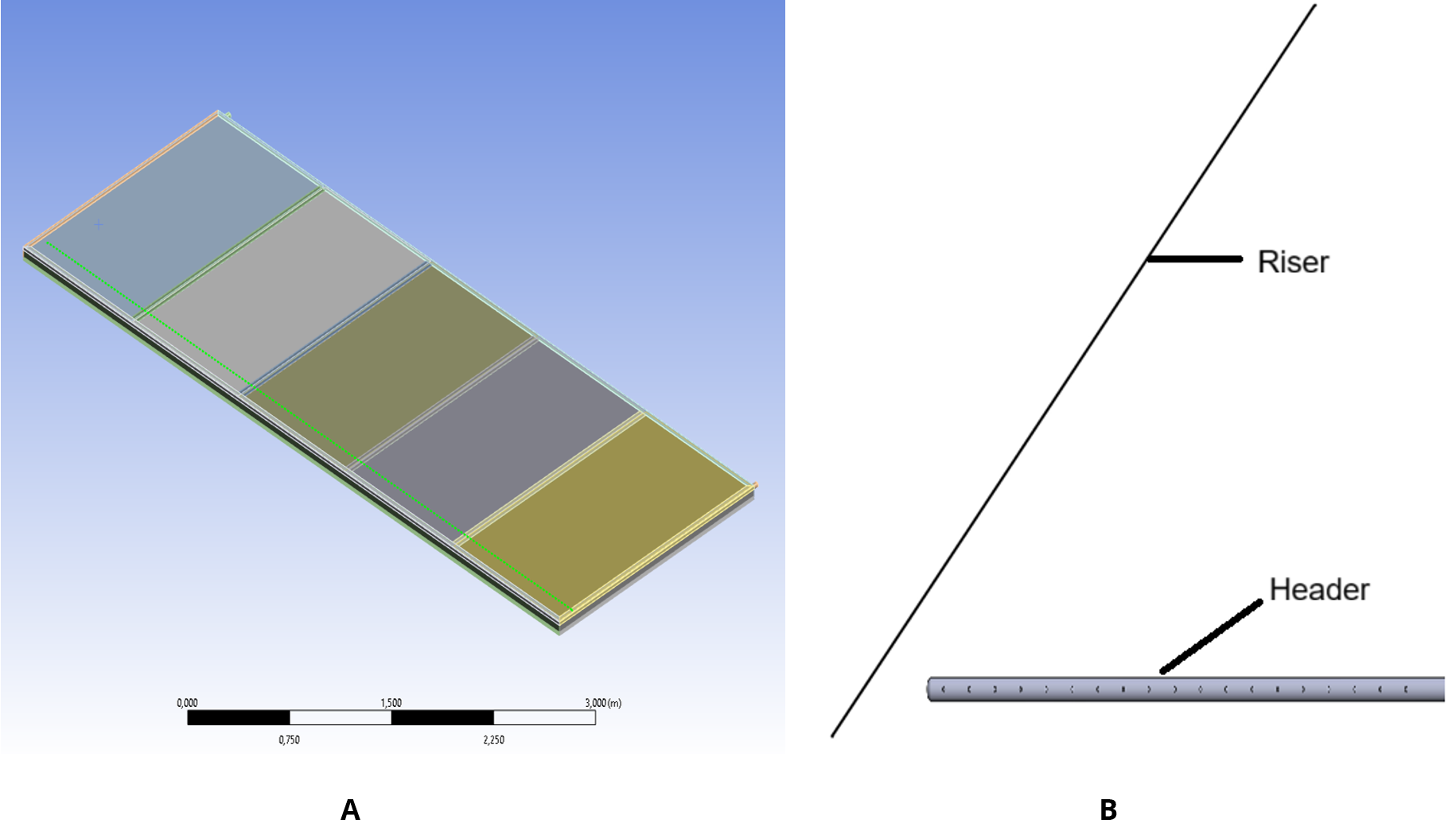 Three models were created in SolidWorks, each with riser lengths of 4.45 m, 5.45 m, and 6.45 m, respectively. The risers had circular cross-sections with a diameter of 8 mm. In contrast, the headers featured a larger diameter of 35 mm to facilitate proper flow distribution. To simulate realistic inlet and outlet conditions, each model incorporated upper and lower headers. An image of the large-scale FPC is shown in Figure 1, while Figure 2 presents the detailed geometry of the corresponding risers and headers used in the CFD model.