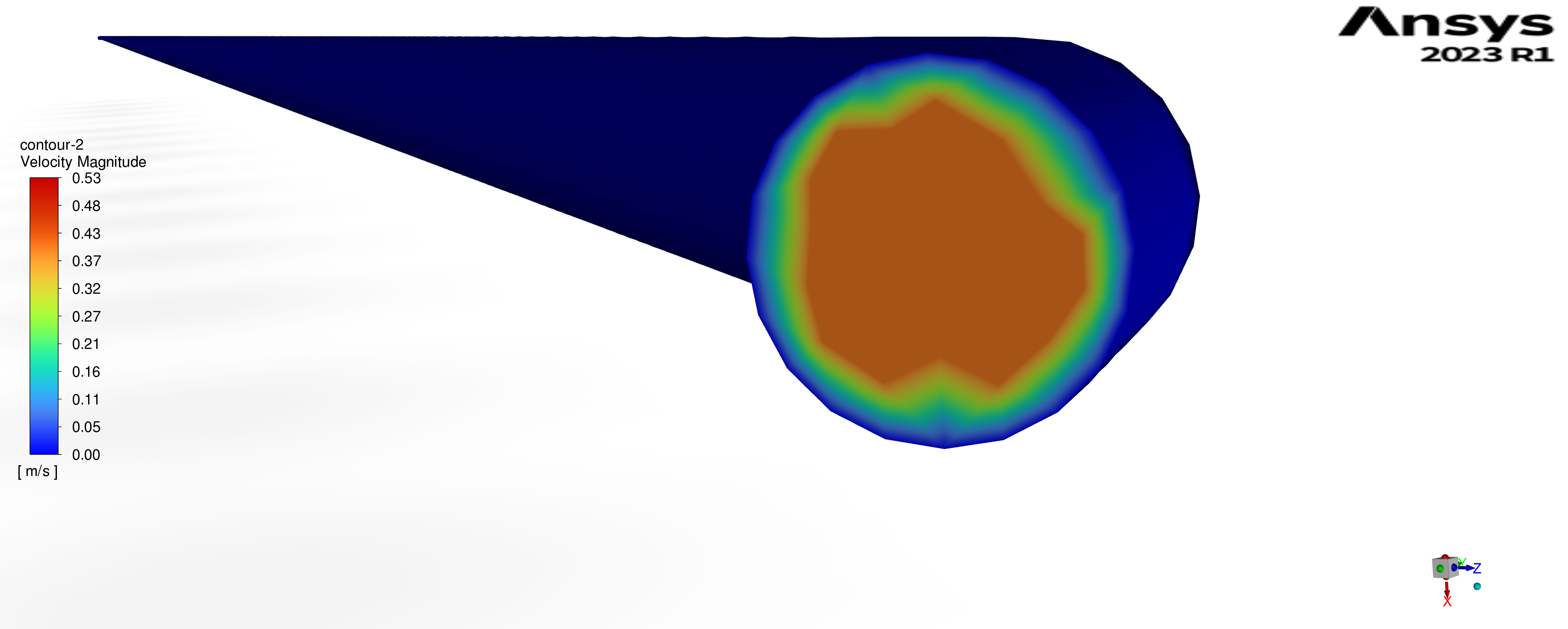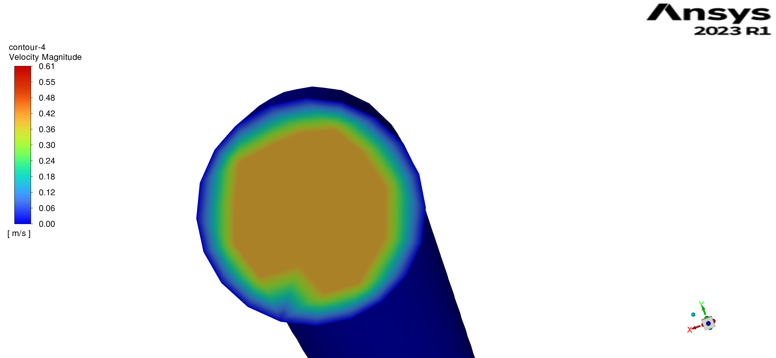 For the 4.45 m riser, the peak outlet velocity is approximately 0.53 m/s (Figure 8). The velocity profile retains a classic parabolic shape, indicating well-developed and uniform axial flow. Owing to the shorter flow path, frictional resistance is the lowest among the three cases, giving a frictional pressure drop of about 2.7 kPa per riser and a corresponding pumping power of roughly 0.054 W at the reference operating point. This configuration is therefore attractive in applications where high throughput and low electrical power consumption of the pump are prioritized.