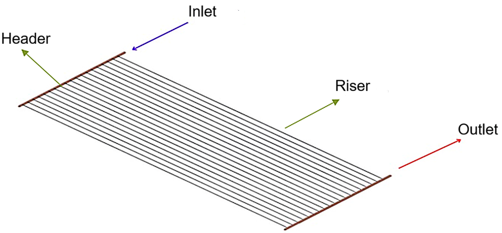 Recent advancements in materials and manufacturing techniques have improved heat absorption and retention, enhancing the performance of large-scale FPCs. Innovative designs, including advanced surface coatings and optimized flow patterns, further enhance efficiency and support long-term viability. The performance of a large-scale FPC largely depends on two key components: the absorber plate and the riser tubes. The absorber plate, typically made of high thermal conductivity materials like copper or aluminum, is coated with selective coatings to maximize solar energy absorption. Meanwhile, the riser tubes, which transport the working fluid, are critical to efficient heat transfer [3,5-8]. Their thermal properties, diameter, arrangement, and length directly influence the collector’s overall performance. Beyond material selection, the way the absorber plate is bonded to the riser tubes significantly affects heat conduction. Proper insulation around the collector is also essential to minimize heat loss and improve efficiency. Additionally, optimizing the choice of working fluid and its flow rate ensures better heat transfer and overall system stability [4,9].