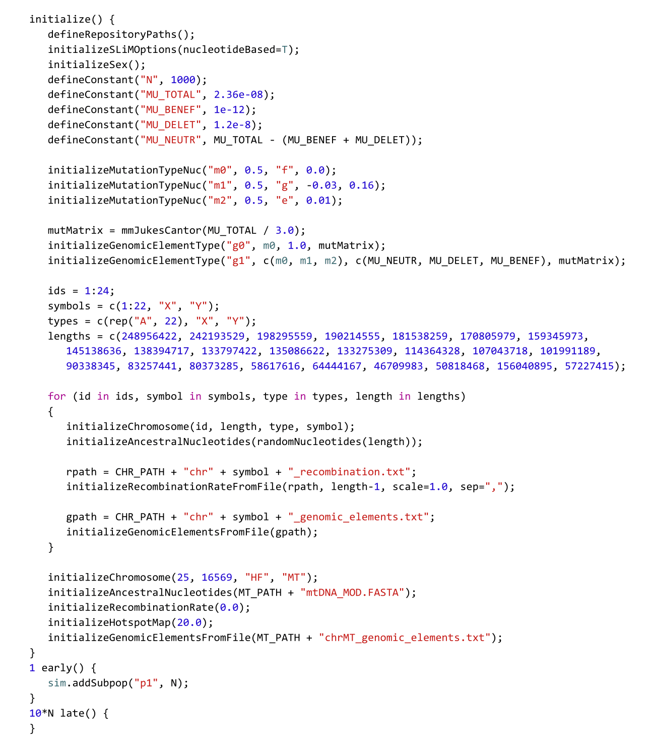 Code Sample 1. The foundational SimHumanity model, containing both neutral and non-neutral mutations simulated for all human chromosomes (including mtDNA) in a population of size N=1000, for 10N (10,000) generations. This model is provided in our repository in the file model1_foundation.slim; that file also contains comments in the code, which have been removed here for brevity. Instead of comments here, this code is discussed in the text. The functions defineRepositoryPaths()