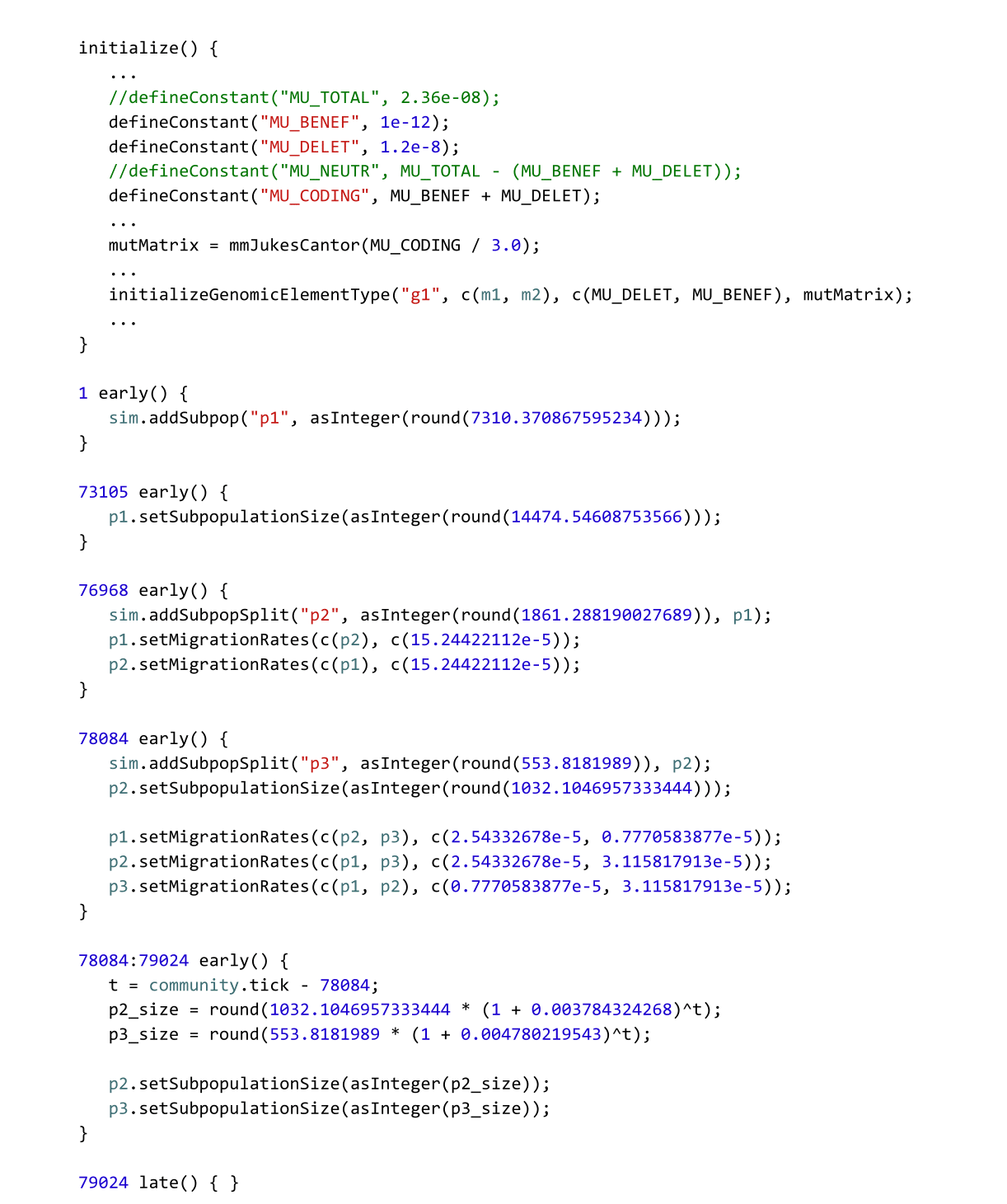 ’s overall mutation rate, for two reasons. One is that our goal is to build a general-purpose human simulator, not to mirror a specific published demographic scenario; and the other is that PosNeg_R24