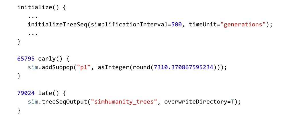 individuals, and therefore triggers the execution of the SLiM simulation by creating a population of individuals that will evolve, according to the Wright–Fisher model, with mating, births, deaths, mutations, recombinations, and so forth. Finally, a 10*N late()