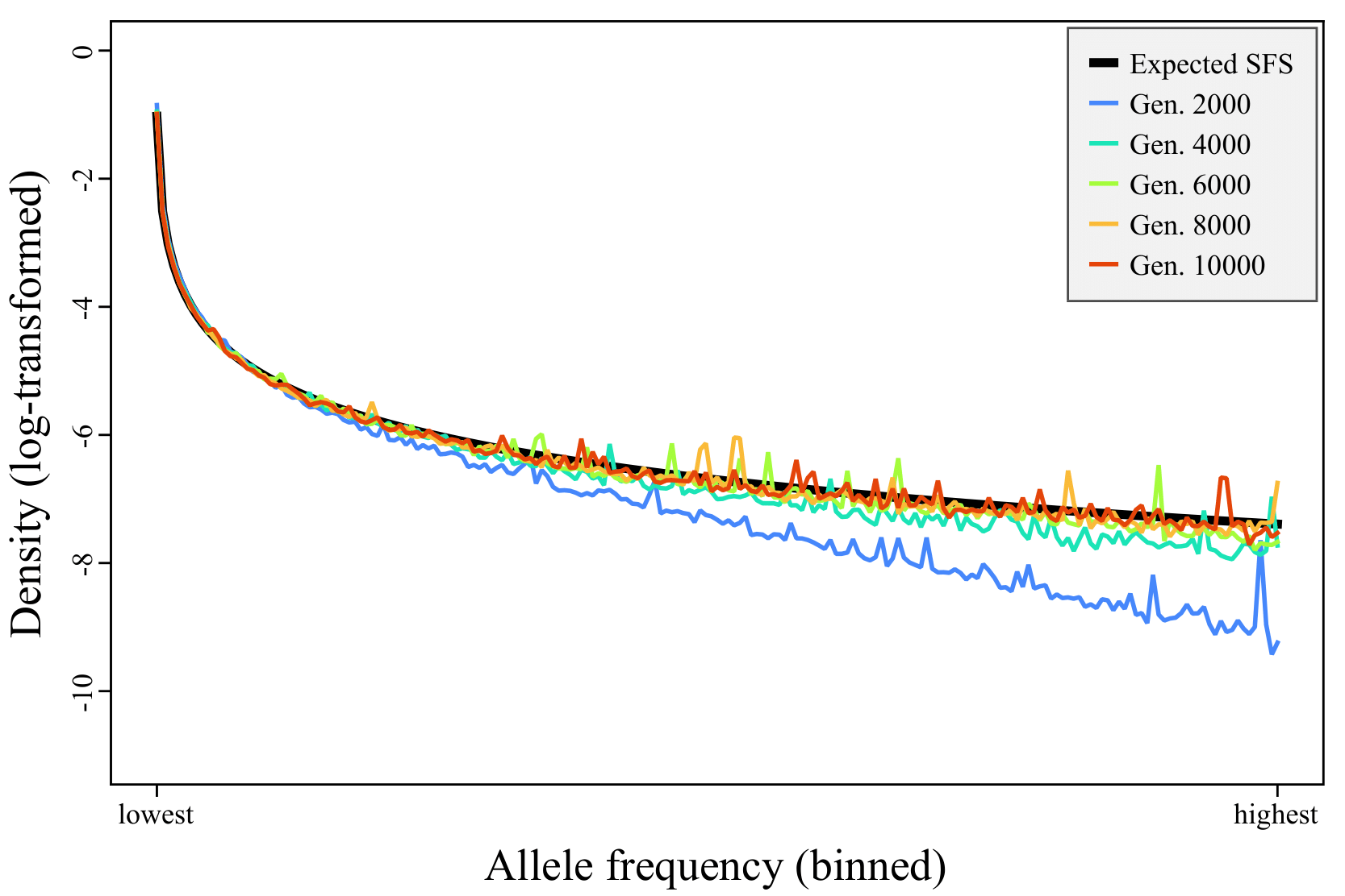 ) that uses SLiMgui’s built-in custom plotting functionality to produce site-frequency spectrum (SFS) plots for the model over time (Figure 1). Early in the run, there is an excess of mutations at low frequency and a deficit at high frequency, because the model starts out with no genetic variation at all; all of the variation present early on comes from new mutations that begin as singletons and have not yet had much chance to rise in frequency. As the model runs, the observed SFS converges towards the expected SFS.