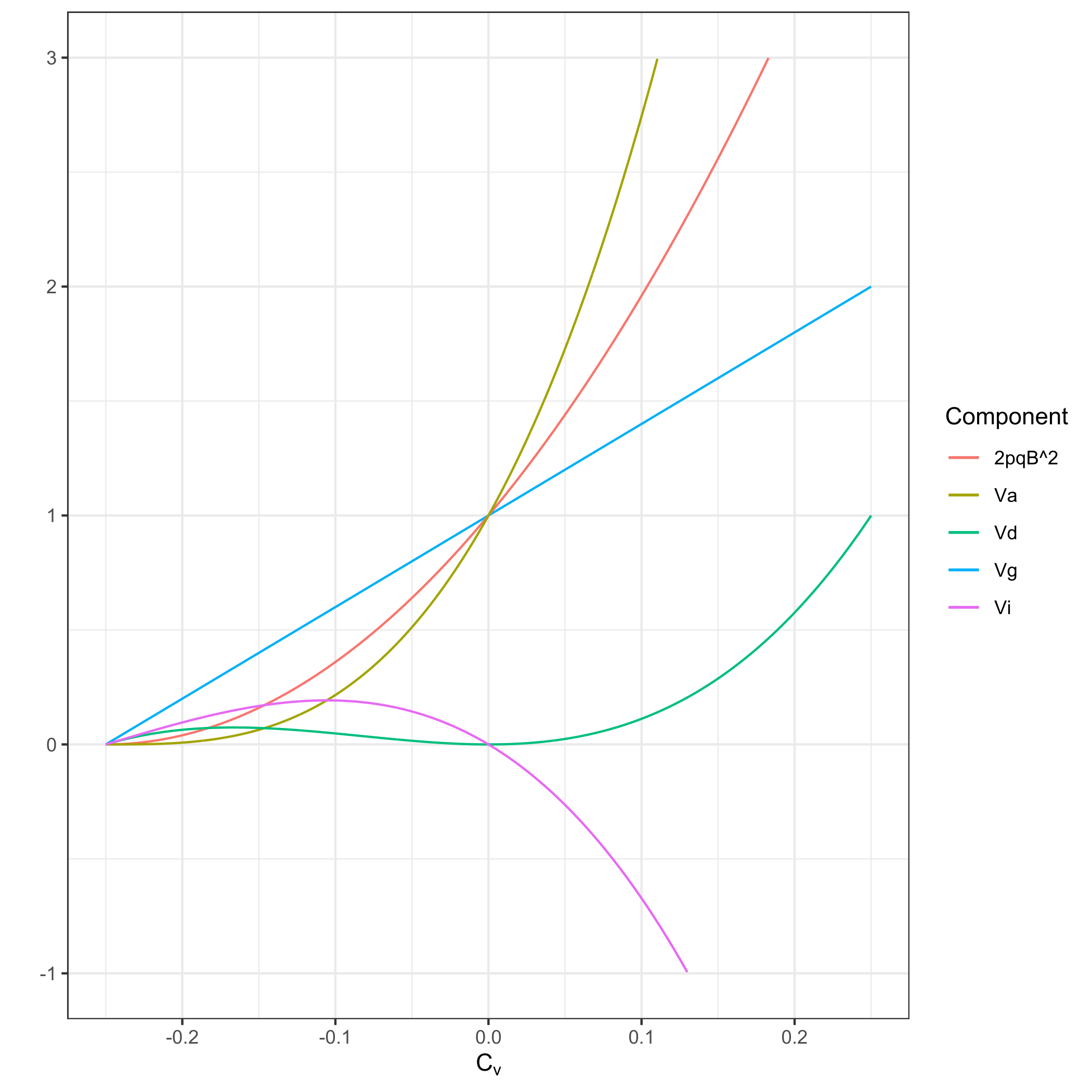 Figure 1 Within locus variance components. Variance components are represented as the ratio of their values in the real population with non-zero covariance in allelic state to their values in an idealized population in HWE, except Vd and VIad which are their values in the real population as they would be 0 in the idealized population.