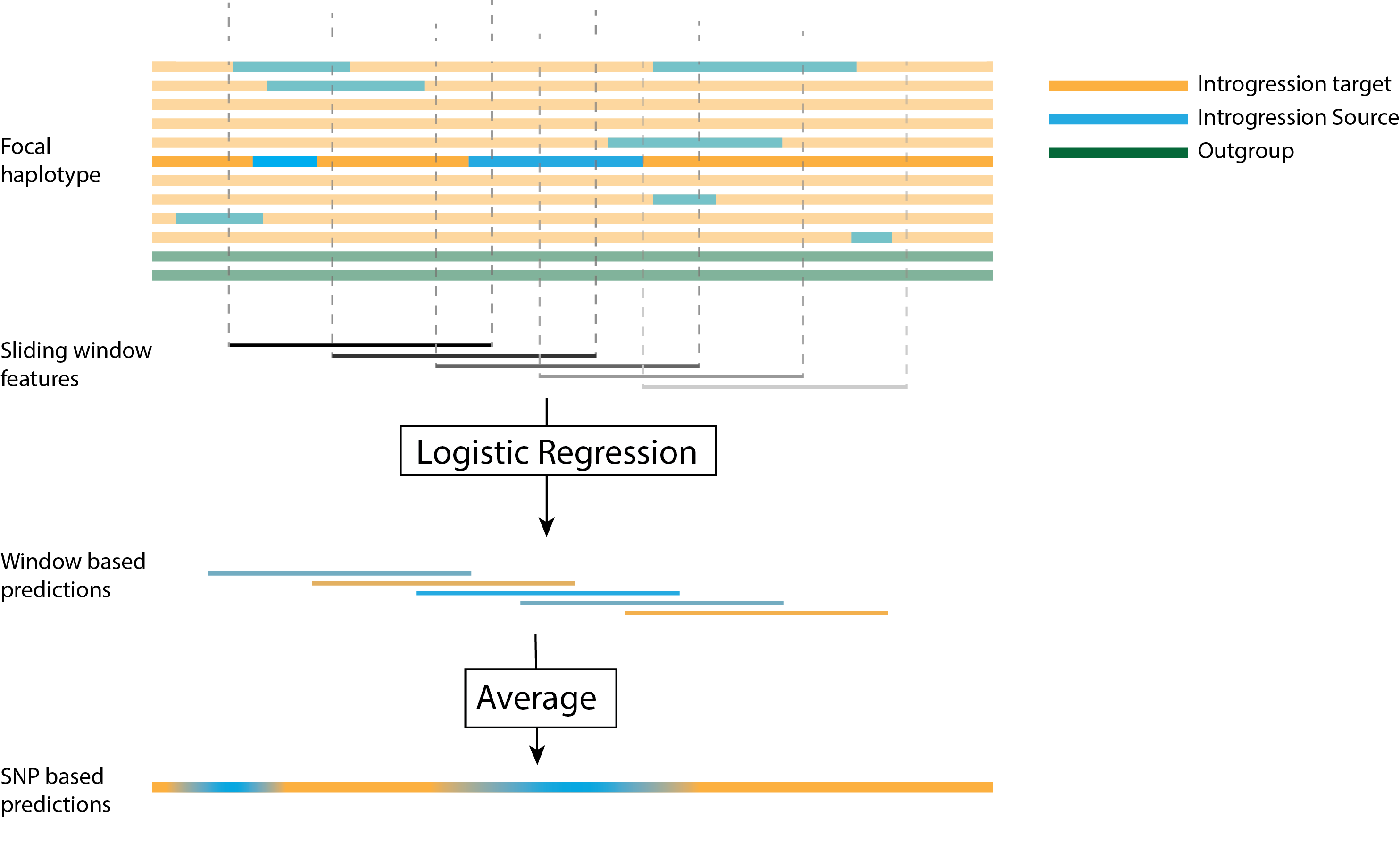 Figure 1. The ArchIE framework. Genetic data are processed into sliding windows, which are then fed into a logistic regression model, the resulting window based predictions are then averaged into SNP based predictions.