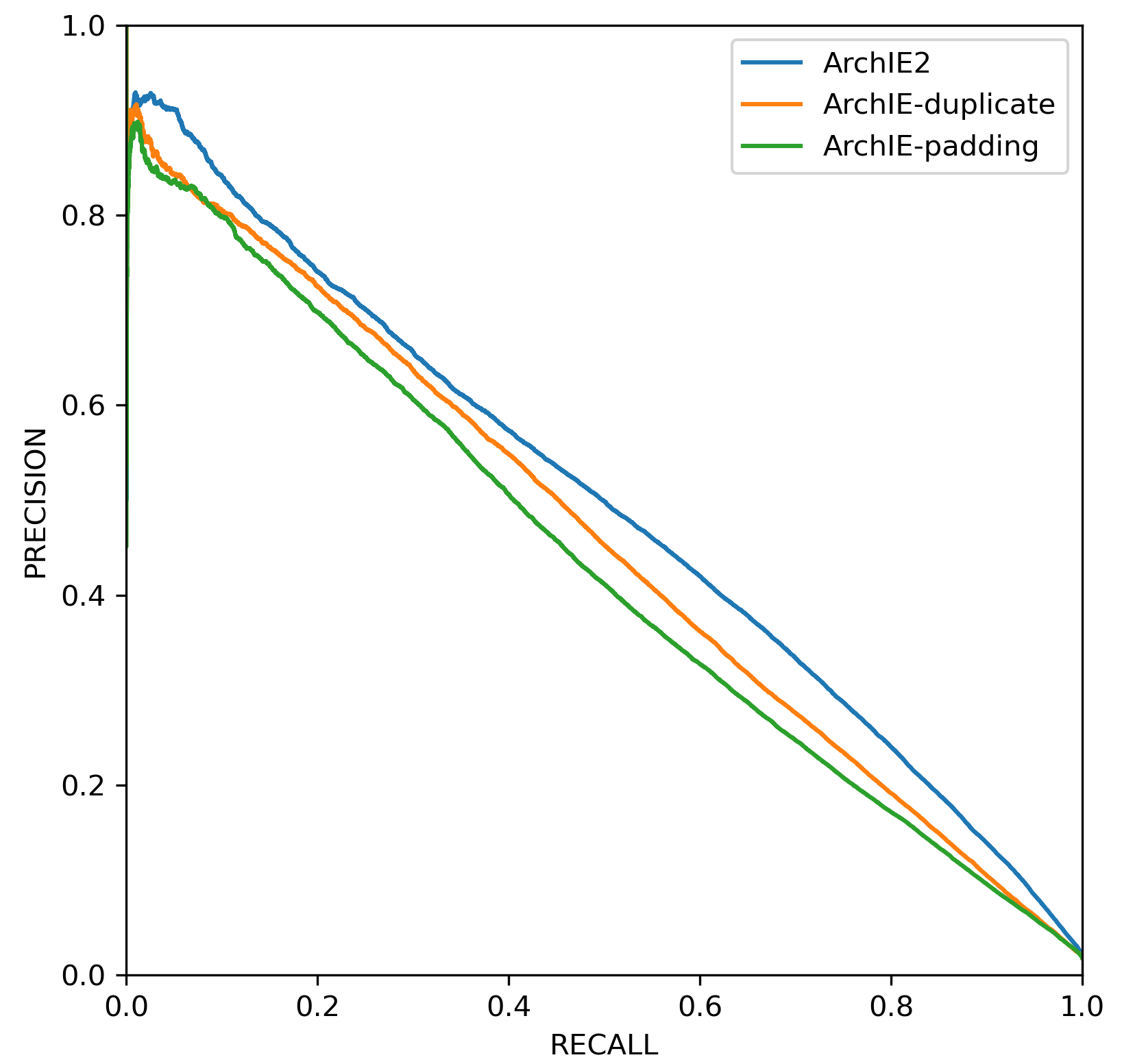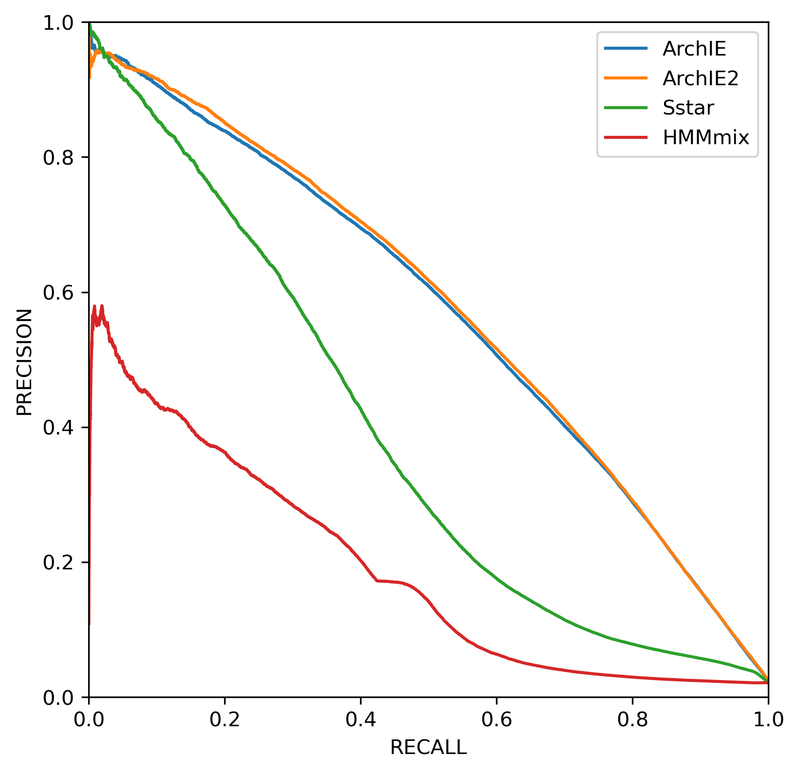 To assess the accuracy of ArchIE2, as well as other methods, we use precision recall curves (PR curves) based on SNP-based callsets. We use PR curves instead of ROC curves due to the imbalanced nature of our dataset, where introgressed sites are rarer than non-introgressed sites. To generate them, we simulate separate testing data in exactly the same manner as in the previous section, with two differences. First, only 100 instead of 500 replicates of 10Mb segments are generated. Second, the sliding window step size is 10kb instead of 50kb for a denser, overlapping coverage. For each scenario, such as different combinations of mutation/recombination rates and different population histories, we generate a separate testing data set. PR analysis was performed based on the SNP callsets generated by the model on the simulated test dataset of interest, compared with the SNP based ground truth.