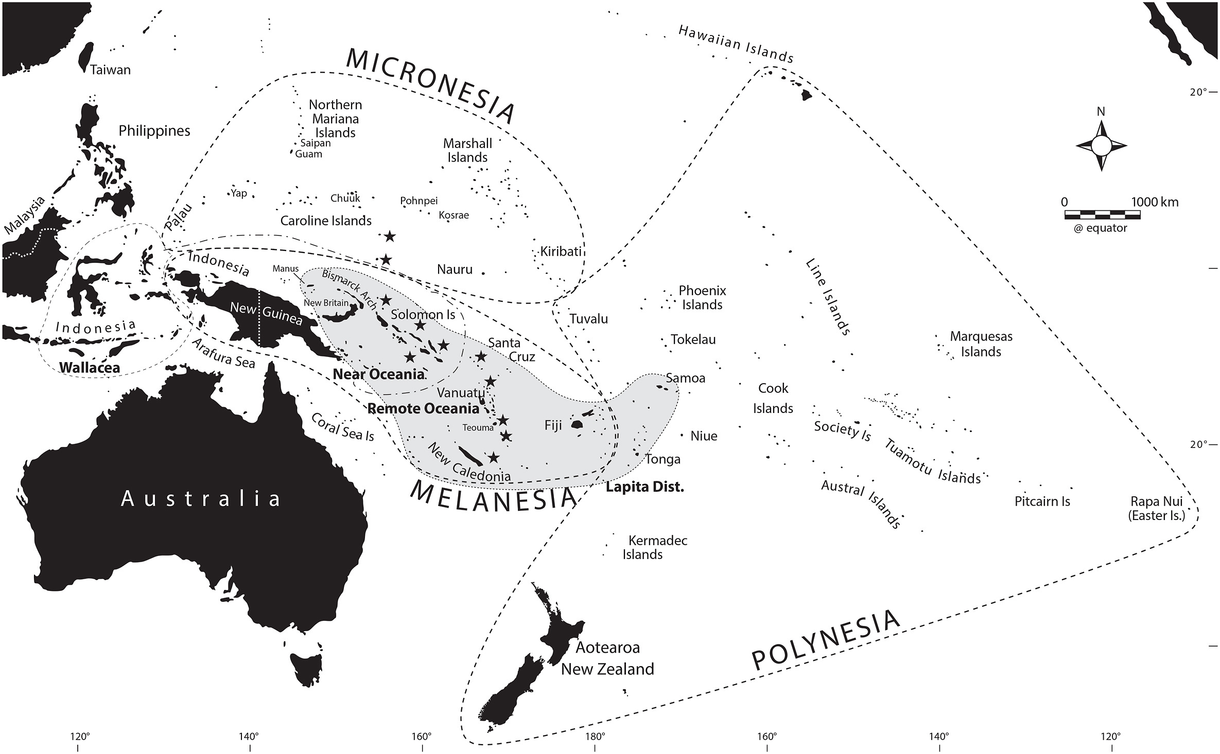 The Pacific is a vast region encompassing roughly half the globe. The Polynesian Triangle alone (that is, the triangle with New Zealand, Rapa Nui, and Hawaii at its vertices) encompasses over 16 million km2, more than twice the size of the continental United States (Figure 1). Traditionally, Oceania (Figure 1) is divided into three main cultural areas, namely Melanesia (the dark islands), Polynesia (the many islands), and Micronesia (the tiny islands). However, these cultural areas do not reflect the colonization history of the region; for this purpose, a more informative distinction is made between Near Oceania (which consists of the main islands of Australia and New Guinea, extending through the Bismarck Archipelago and the main chain of the Solomon Islands) and Remote Oceania (all of the other islands east and north of Near Oceania, see Figure 1). Humans reached Near Oceania by at least 40-45 thousand years ago (ky) [3,6], when sea levels were much lower and Australia and New Guinea were connected as a single landmass known as Sahul. The water crossings necessary to reach Sahul from Sunda (the continental Asian landmass that included the present islands of Sumatra, Java, and Borneo) at this time were all intervisible (meaning that voyagers would see some indication of land ahead of them before losing sight of land behind them) and hence did not require sophisticated boating technology or navigation skills. By contrast, to reach the various islands of Remote Oceania meant crossing several hundred to a few thousand kilometers of open ocean, and required more sophisticated boating technology (e.g., outrigger canoes) and navigational skills. Even so, Remote Oceania was colonized beginning about 3-3.5 kya, with the remotest islands reached by about 1 kya [7,8] – and this at a time when European ships did not dare venture very far out of sight of land.