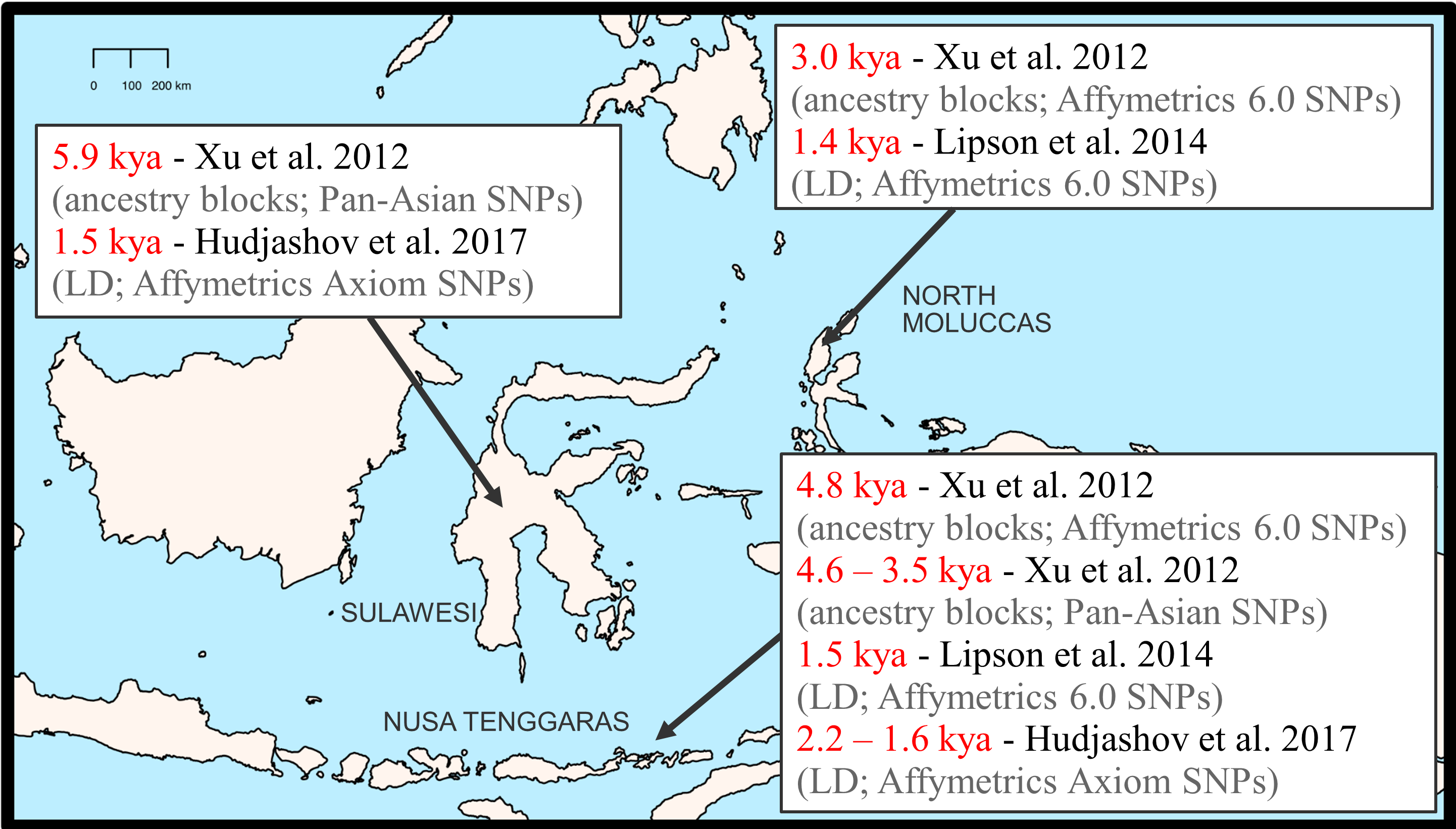 Xu S, Pugach I, Stoneking M, Kayser M, Jin L. Genetic dating indicates that the Asian–Papuan admixture through Eastern Indonesia corresponds to the Austronesian expansion. Proc Natl Acad Sci U S A. 2012;109(12):4574-4579.