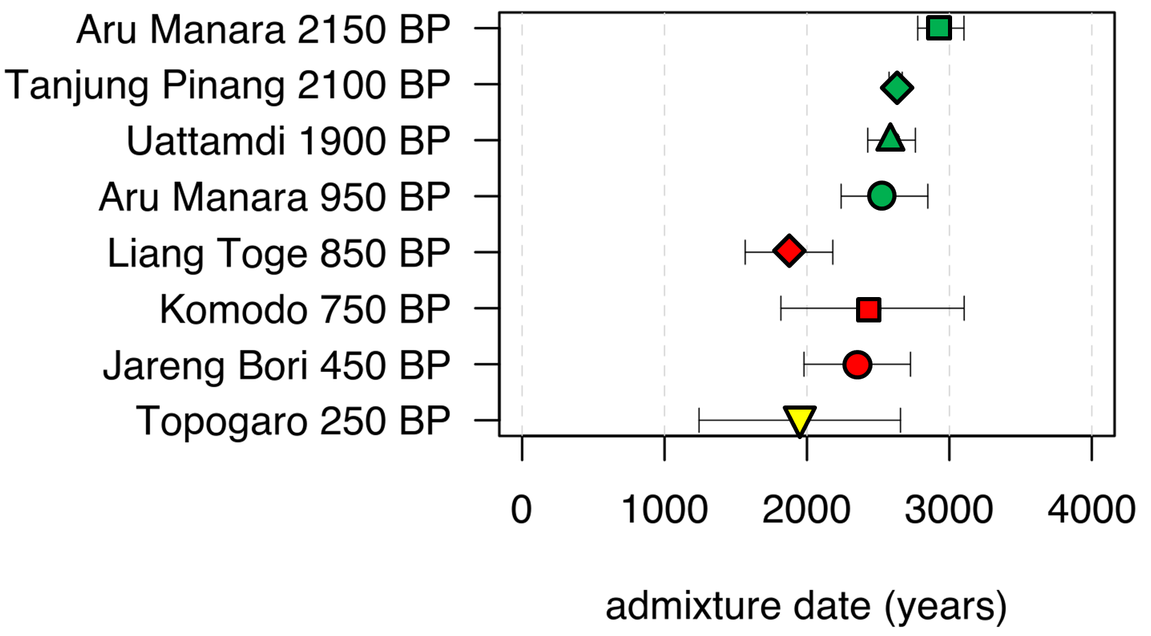 While it would be of interest to know when the SEA ancestry was contributed to NTT, we could not reliably distinguish between the Austronesian and SEA ancestries in the dating analysis. We therefore focused on dating the Papuan-Austronesian admixture, using a method (DATES; [23]) that can be applied to single, low-coverage ancient genomes. The results (Figure 4) indicate that admixture occurred around 2.5-3 kya, which is close to archaeological and linguistic estimates as to when Austronesians first arrived in the area [15,17].