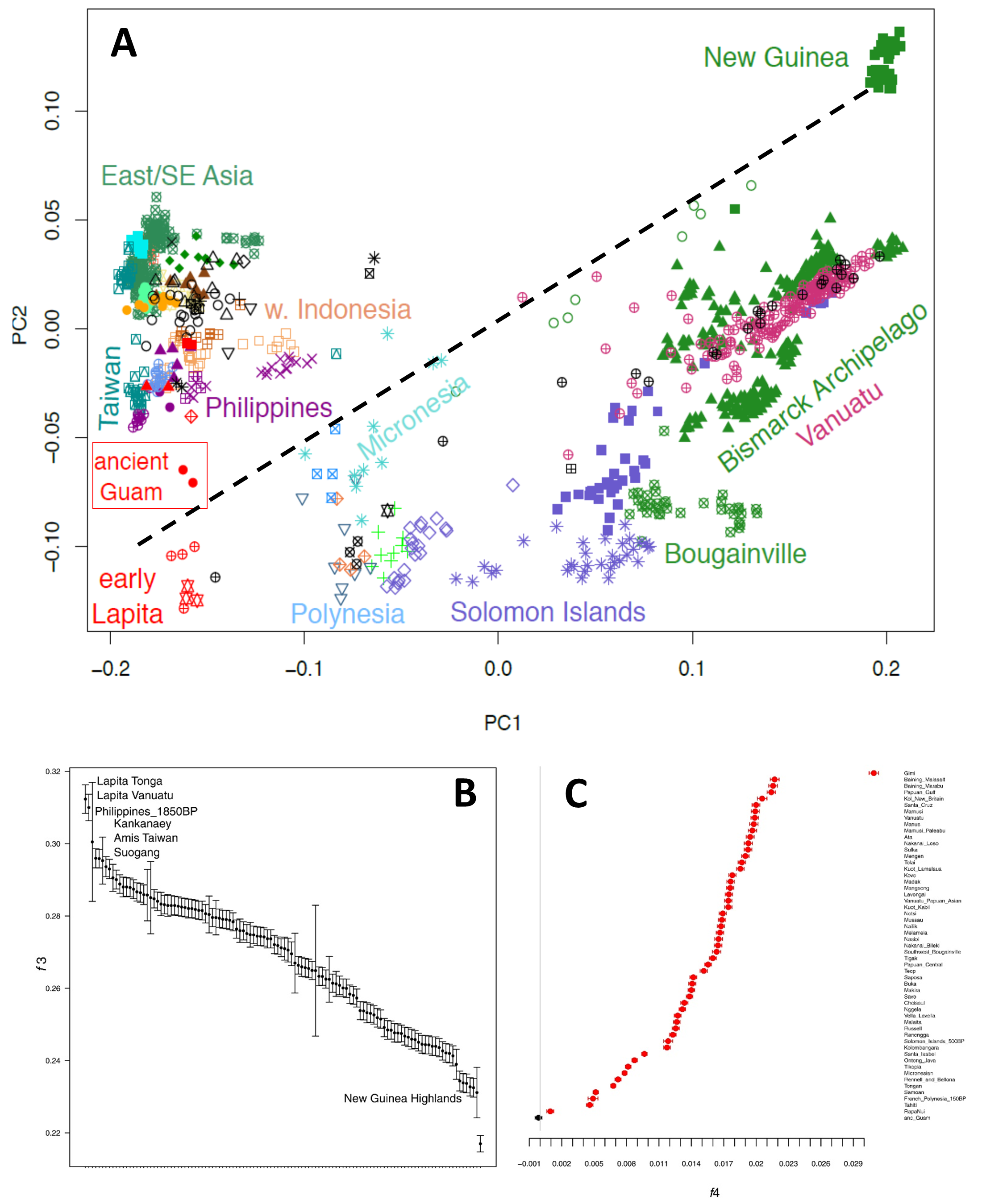 The usual PCA analysis, with a variety of modern and ancient samples from East Asia, Southeast Asia, and Near and Remote Oceania, shows a gradient of ancestry from East Asia to New Guinea, with the two ancient Guam samples right at the East Asian pole (Figure 6A) – and, intriguingly, close to early Lapita samples from Vanuatu and Tonga, in Polynesia (more on this later). So, this analysis suggests no Papuan-related ancestry in the ancient Guam samples. We investigated this in more detail by a variety of analyses, including outgroup f3 and f4 statistics. The f3 analyses indicate how much genetic drift is shared between the ancient Guam samples and a variety of other populations, and the results show that the ancient Guam samples are closest (i.e., share the most genetic drift) with the early Lapita samples, an ancient sample from the Philippines, and modern samples from the Philippines and Taiwan (Figure 6B). They share less genetic drift with Papuans than with any other population in the analysis (except Europeans). The f4 analyses test if a group shares more ancestry with New Guinea highlanders than do the Kankanaey, a modern group from the Philippines which does not show any indication of Papuan-related ancestry. All groups tested from Oceania show significant amounts of Papuan-related ancestry – except for the two ancient Guam samples (Figure 6C). None of the analyses we did detected any indication of any Papuan-related ancestry in the ancient Guam samples, and we consistently found that samples from the Philippines were genetically close to the ancient Guam samples (so, it would appear that we need to rethink the computer simulations of ancient voyaging!). A later study that included many more samples from Guam came to the same conclusion of a likely origin from the Philippines [35].