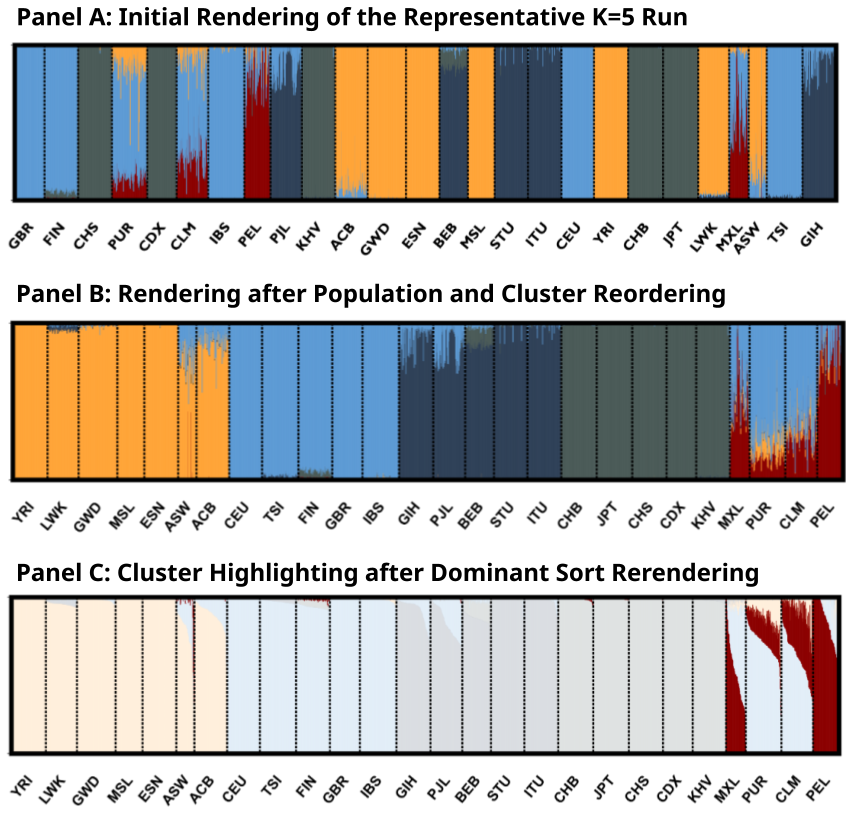 Highlighting A Cluster (Feature 5 in Table 1) helps focus on a specific aspect of the results. For example, in Figure 2C, a single highlighted cluster is clearly most common among several Admixed American populations (PUR, MXL, PEL, and CLM) from the 1kG data, suggesting both shared admixture proportion and variation in this shared proportion among these groups. Sorting by Cluster Dominance (Feature 3 in Table 1) rearranges the individuals into descending orders of each population’s largest cluster, which creates a cleaner and more intuitive view of how clusters are distributed. For example, the highlighted cluster in Figure 2C is a minor component for populations PUR (Puerto Ricans in Puerto Rico) and CLM (Colombians from Medellín, Colombia), but is dominating the population PEL (Peruvians from Lima). Each interactive feature is useful for examining different aspects of the data. We encourage users to explore and experiment to find the visual options that best fit their specific needs.